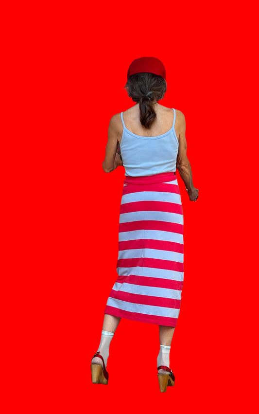 Amoeba Blue/Red Stripe, Formfitting Stretch, Suspender, Midi-Length, Tank Dress W/Handmade Puffy Amoeba Flower