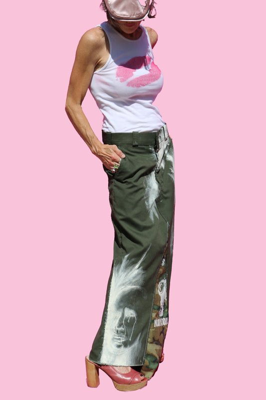 Army Green Work Pant Straight Maxi Skirt W/Hand Painted Man & Camo Noxious Logo Insert