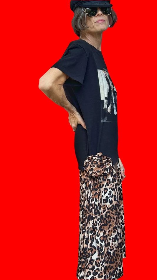 Black Bob Dylan Highway 61 Revisited Leopard Jersey Midi-Length Dress W/Gathered Flower On Hip
