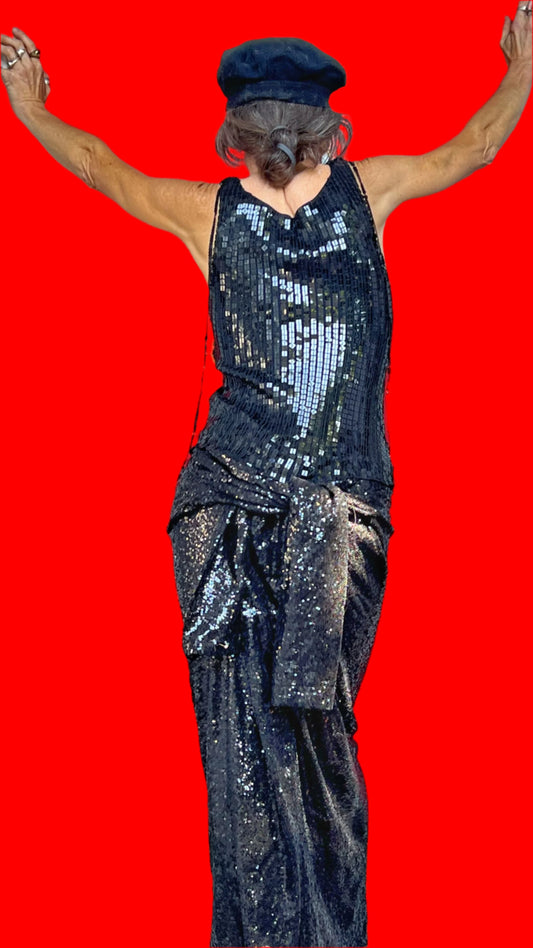 Nirvana Black, Sequined Back, Form-Fitting Sequined Maxi Dress W/Dress Shoulder Tieback & Sequin Shoulder Ties