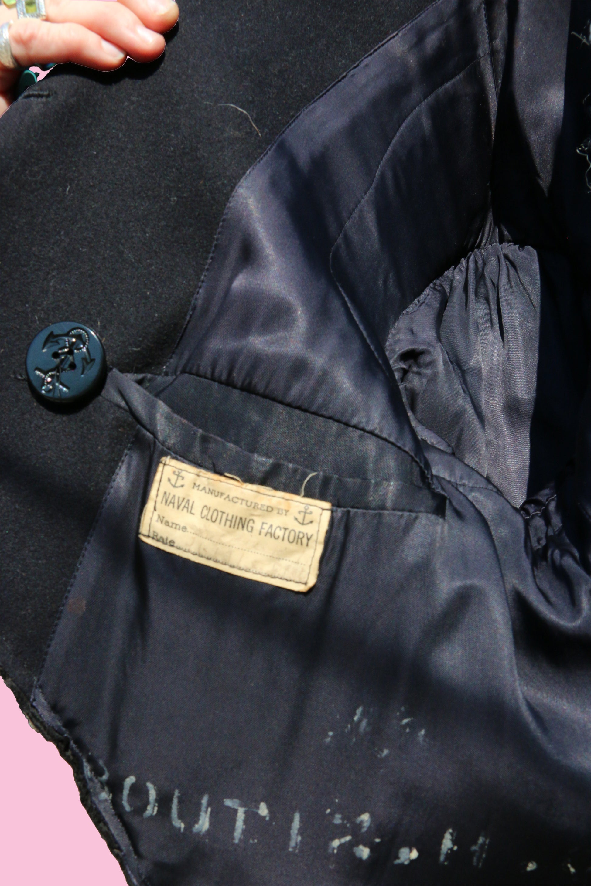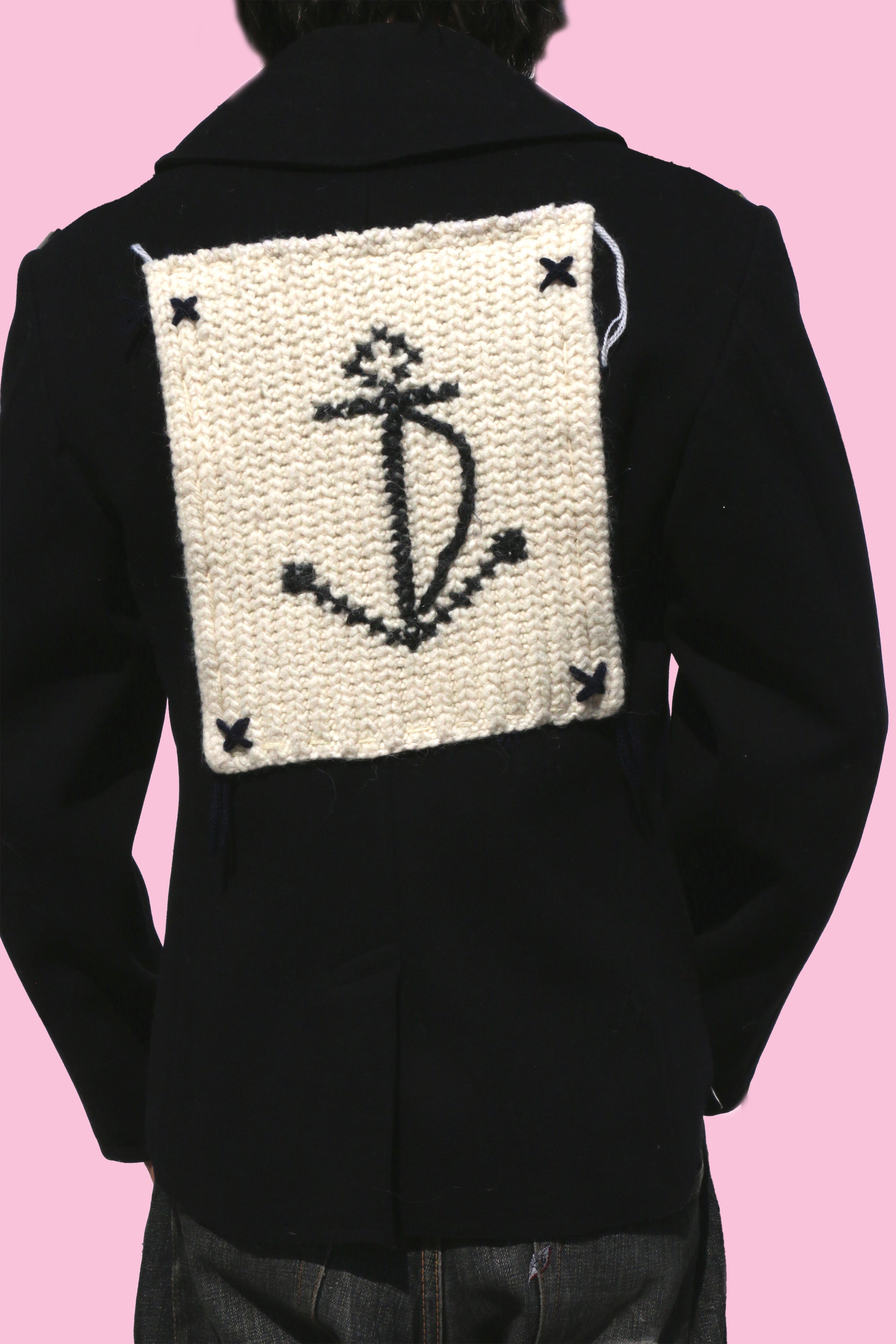 Contents: Vintage Navy Wool Peacoat + hand knit anchor back patch