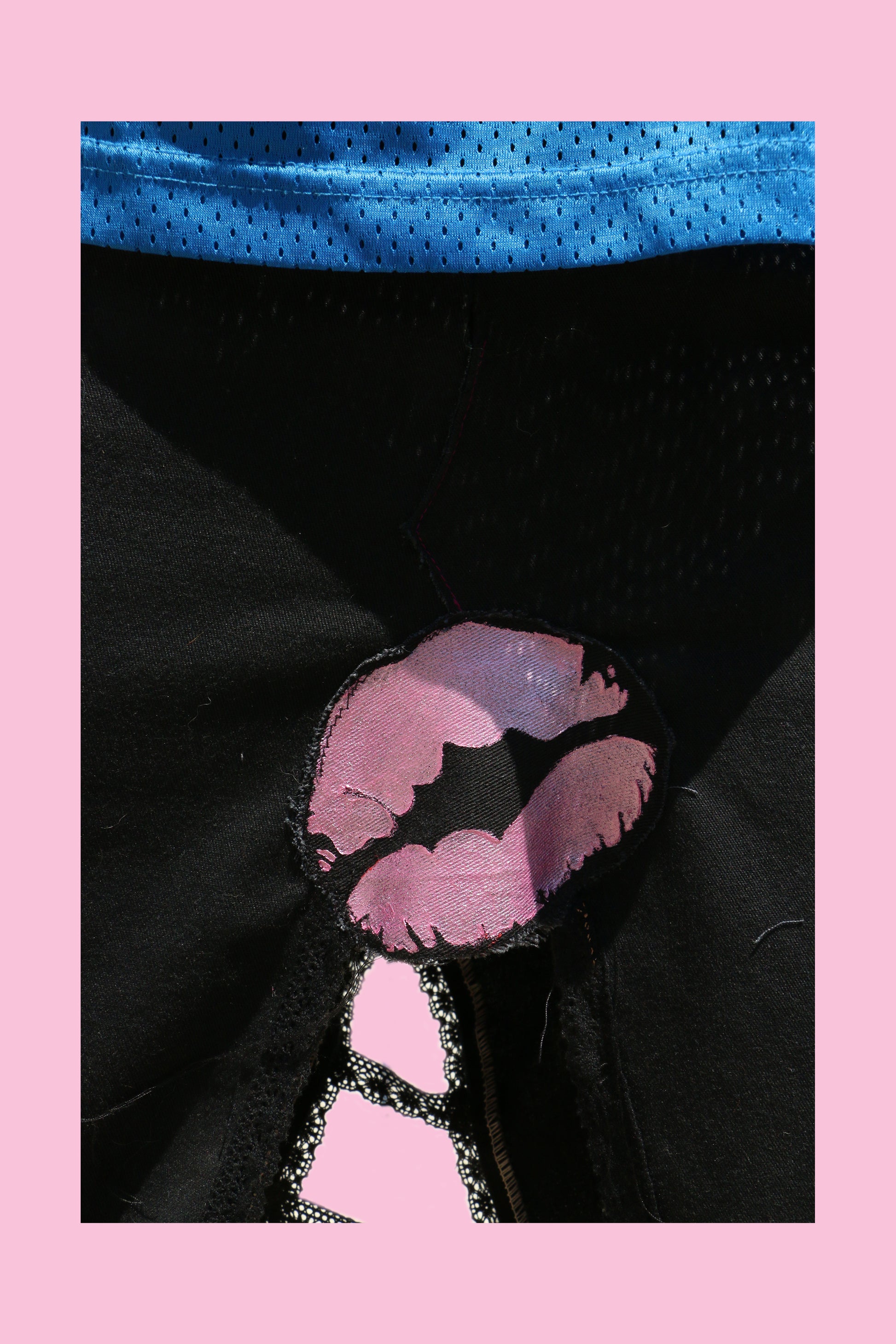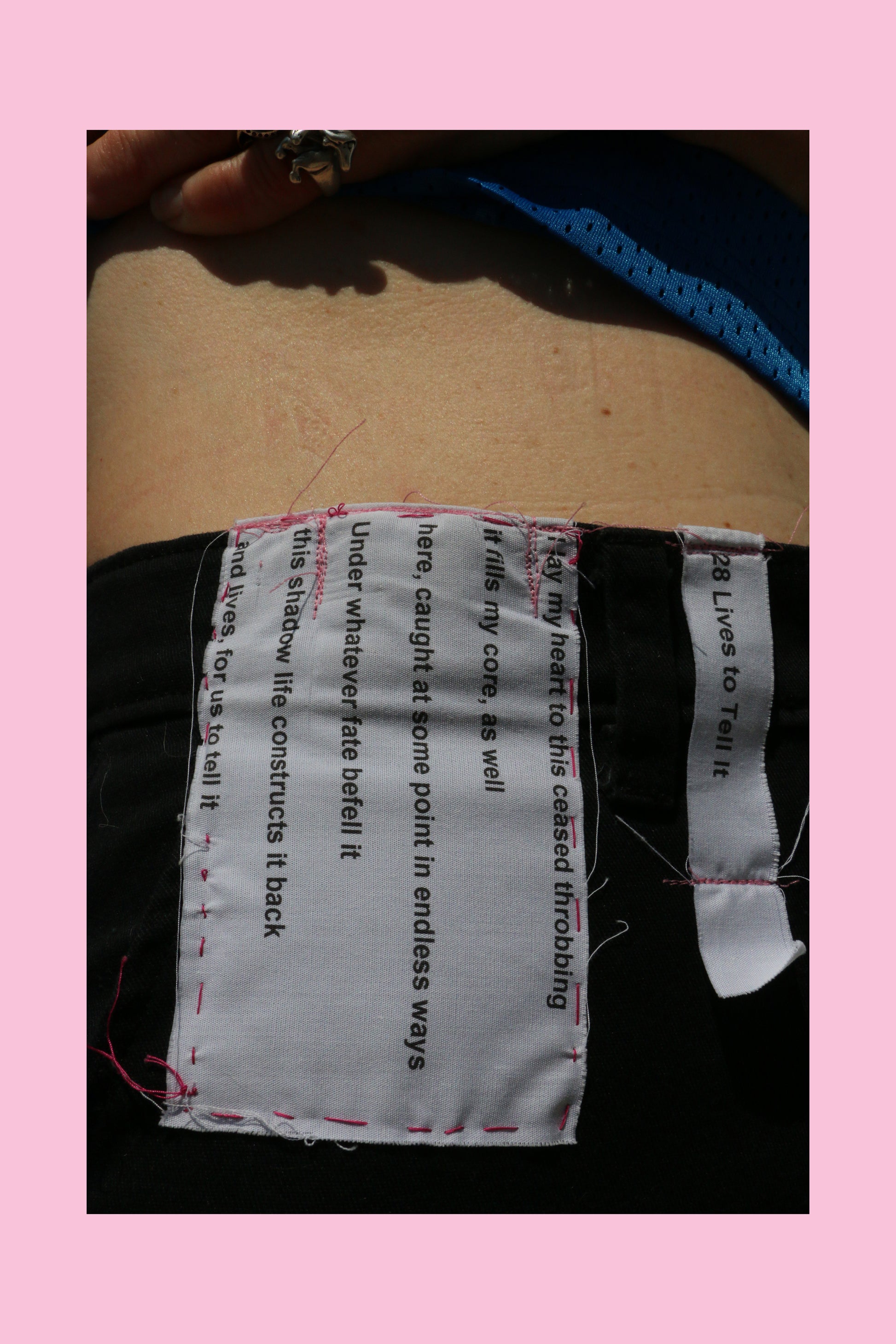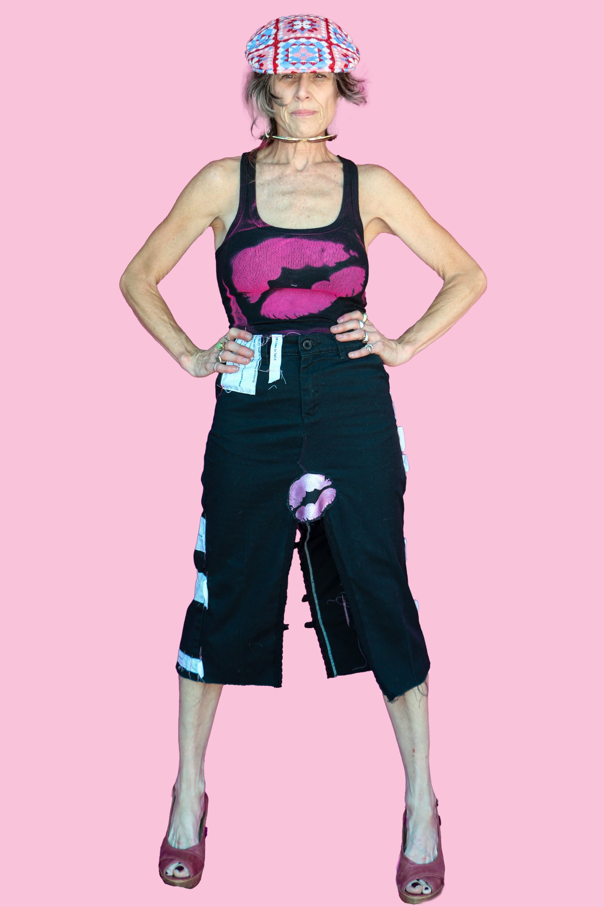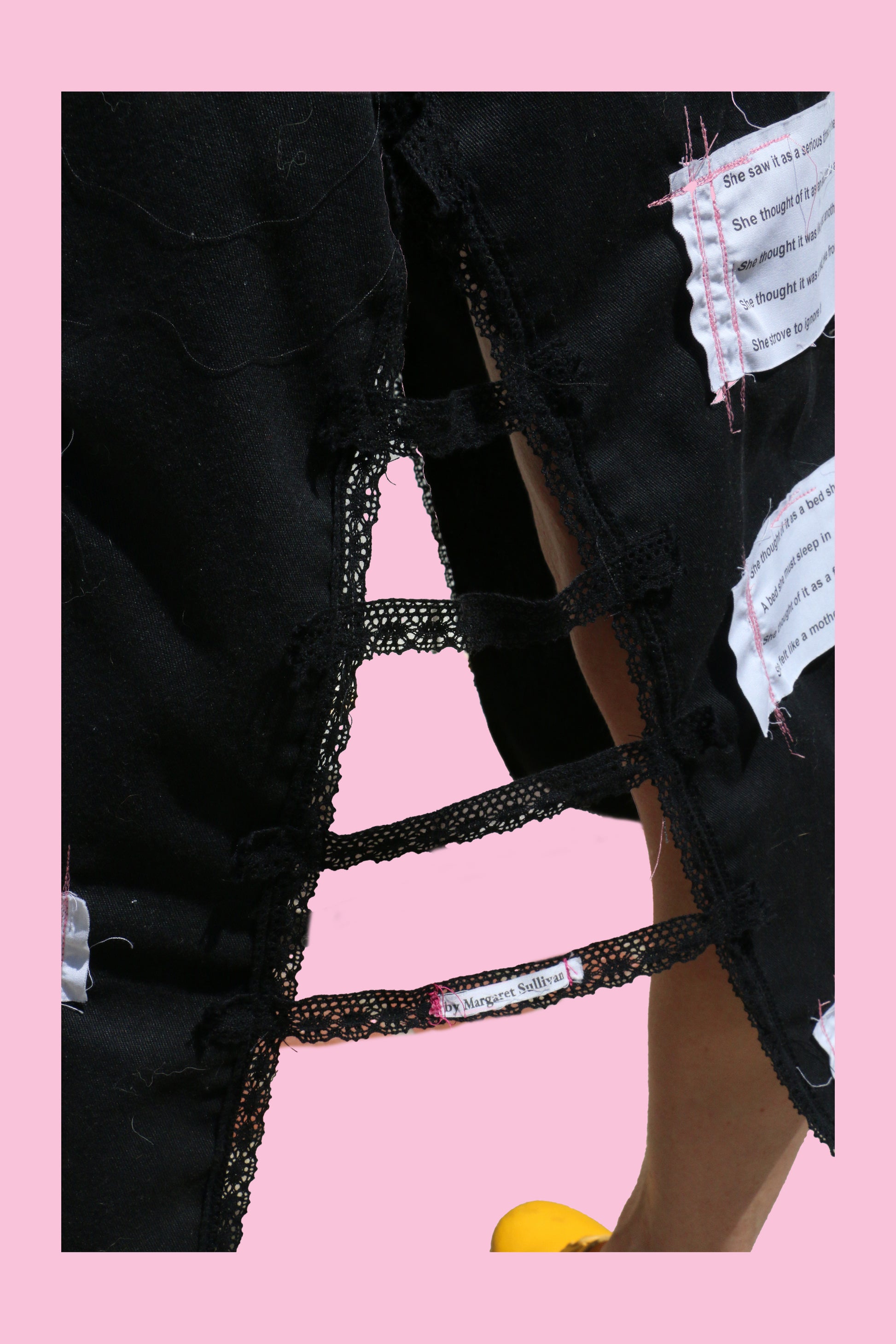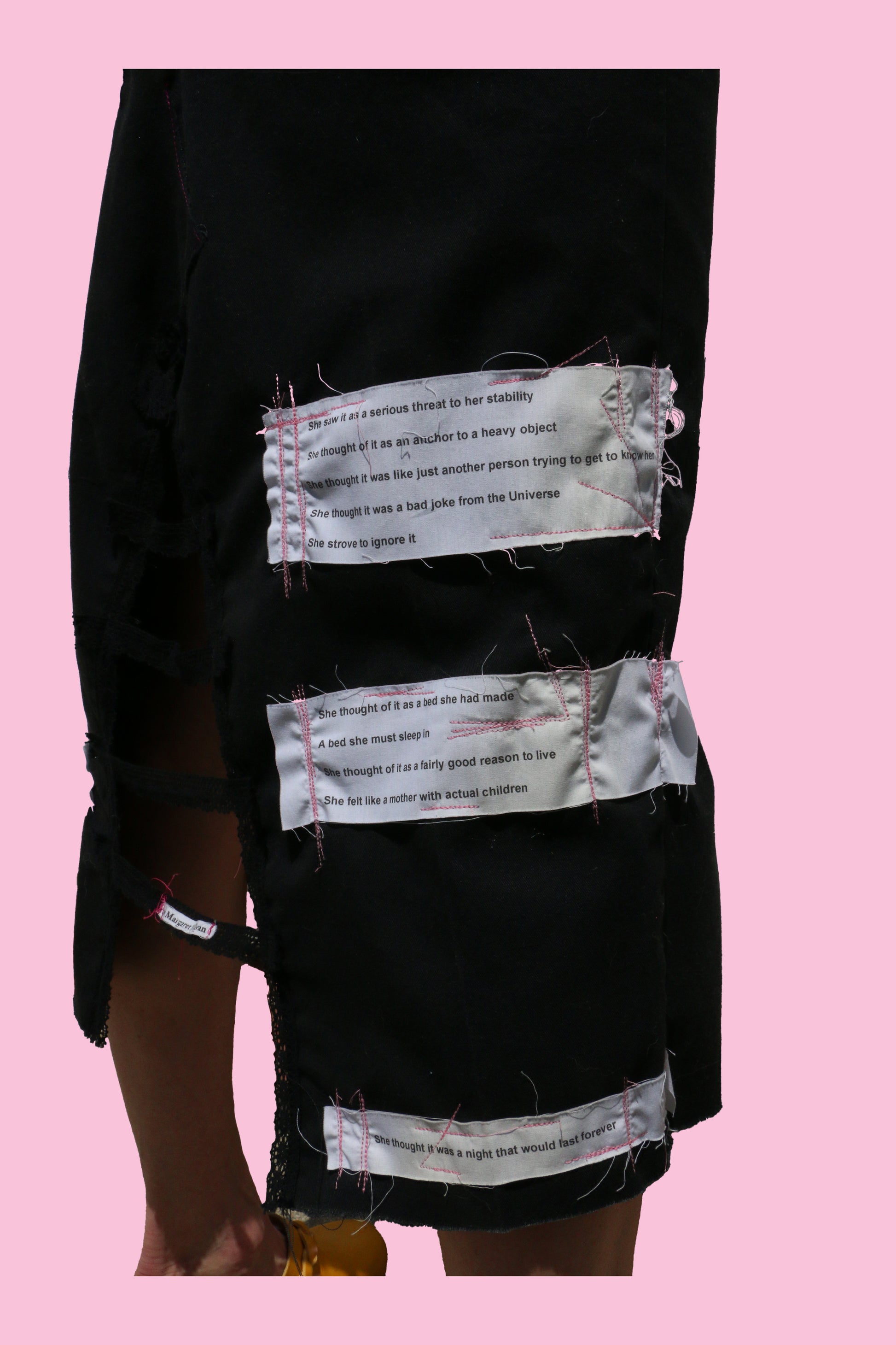 Details include: Black midi-length skirt w/black cotton lace strapping, hand-painted lip patch & two beautiful poems overstitched in pink.