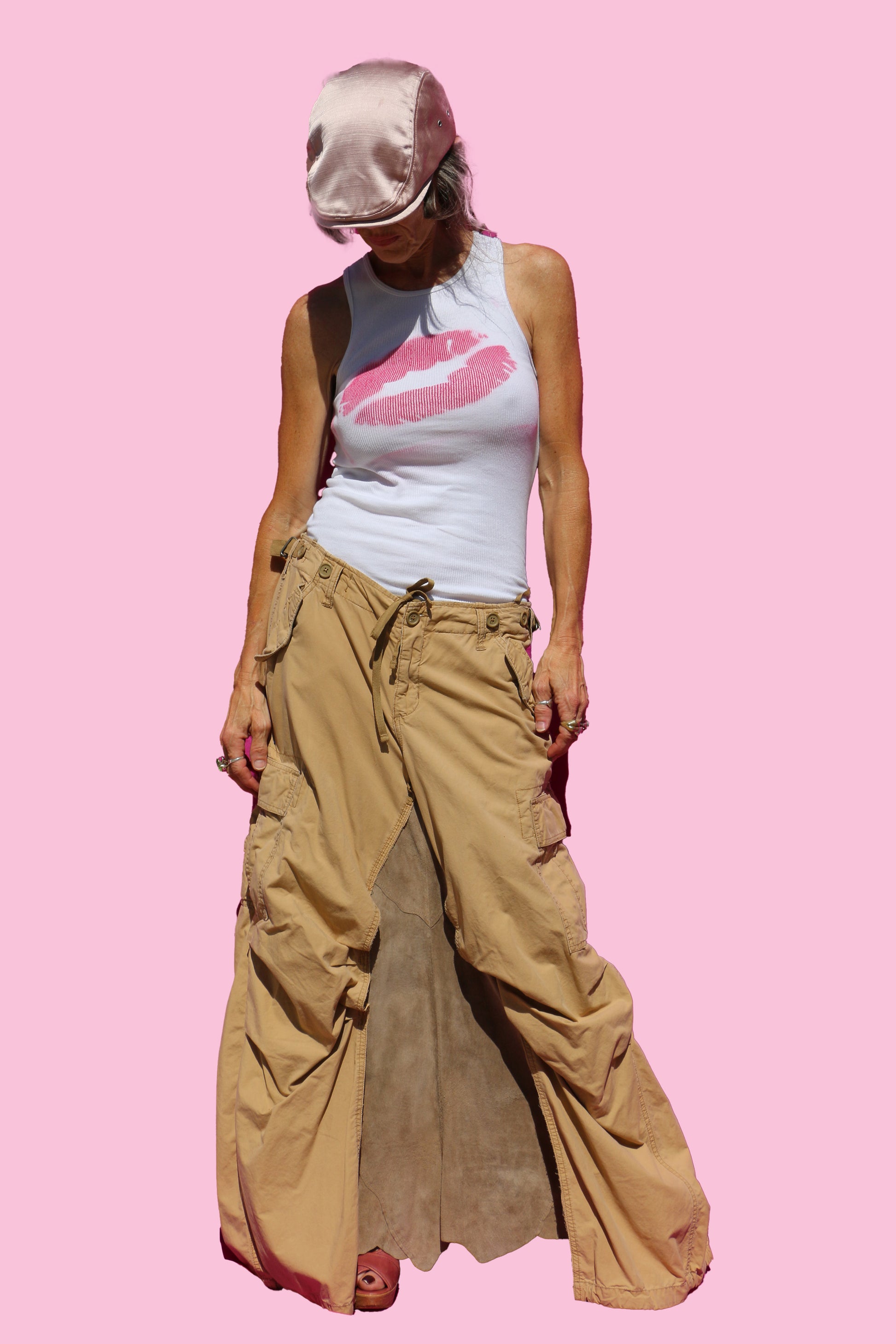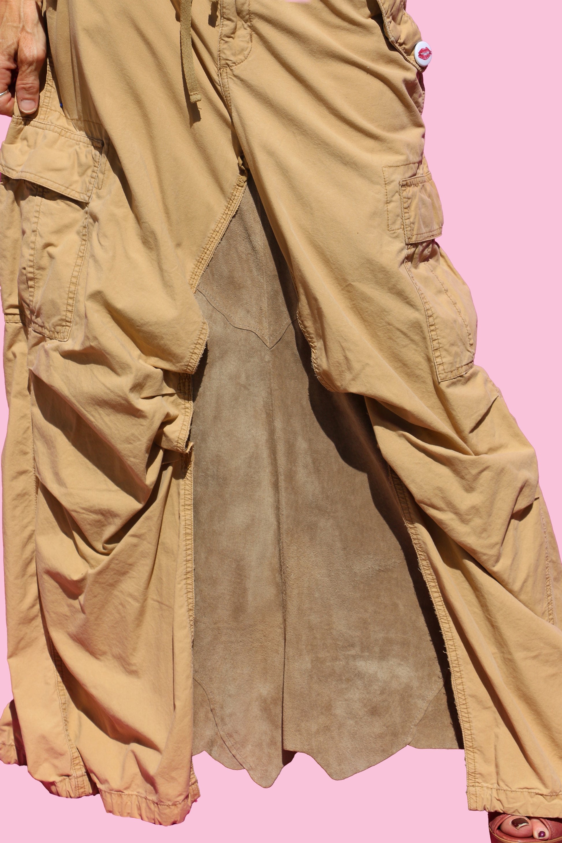 I took my 90's Abercrombie tan cargo pants w/adjustable side buckles & strapping. These are good!! You can't find them like this anymore. I paired them with a thrifted, damaged suede skirt to create bad-ass yet sexy, slouchy maxi skirt. You'll be ready for ANYTHING in this one. Adjustable to fit many. Remember, you can wash suede. Just don't dry it.
