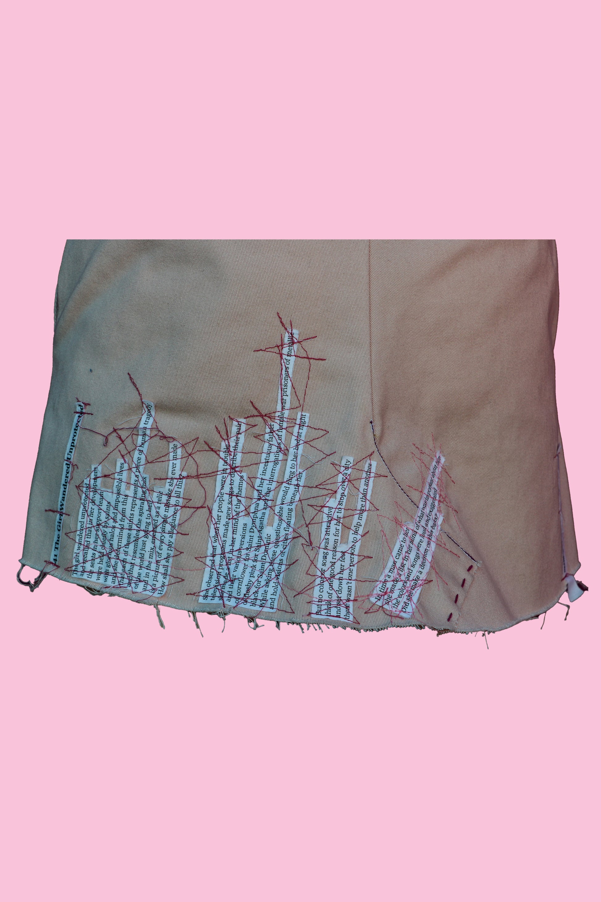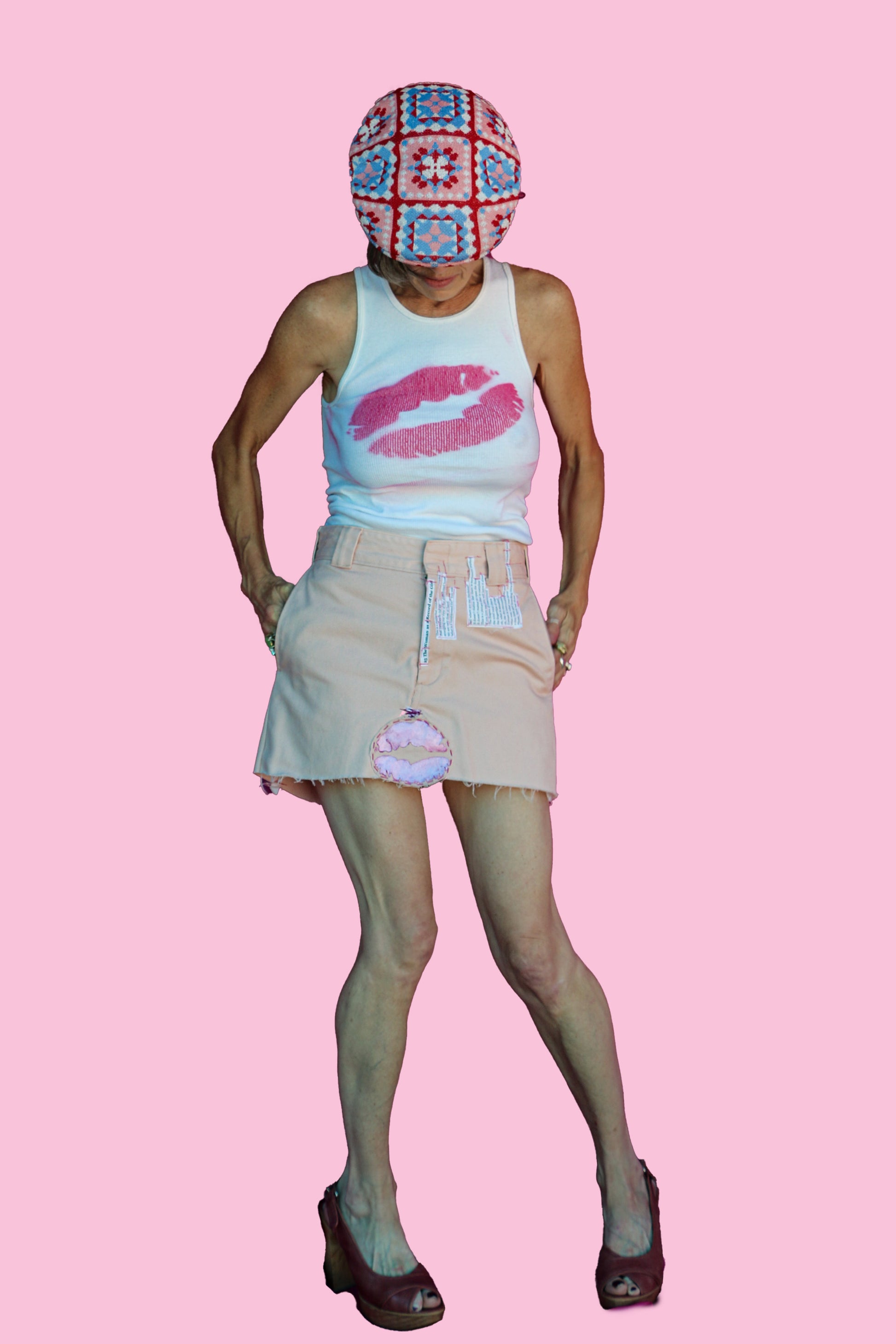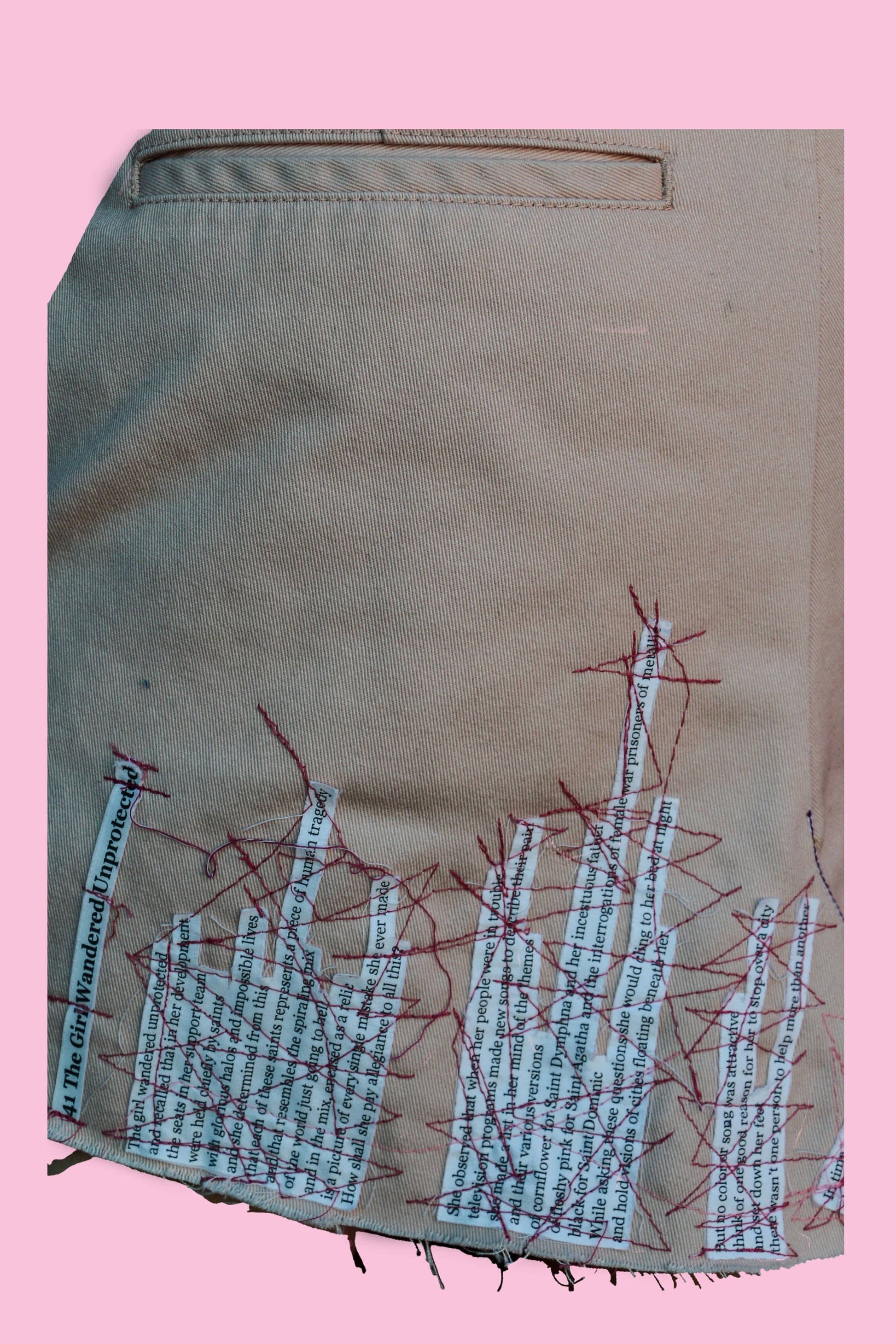 Details include: Blush pink miniskirt w/hand-painted metallic lip patch placed inappropriately, of course. All overstitched in pink, of course, because these poems are very girly.