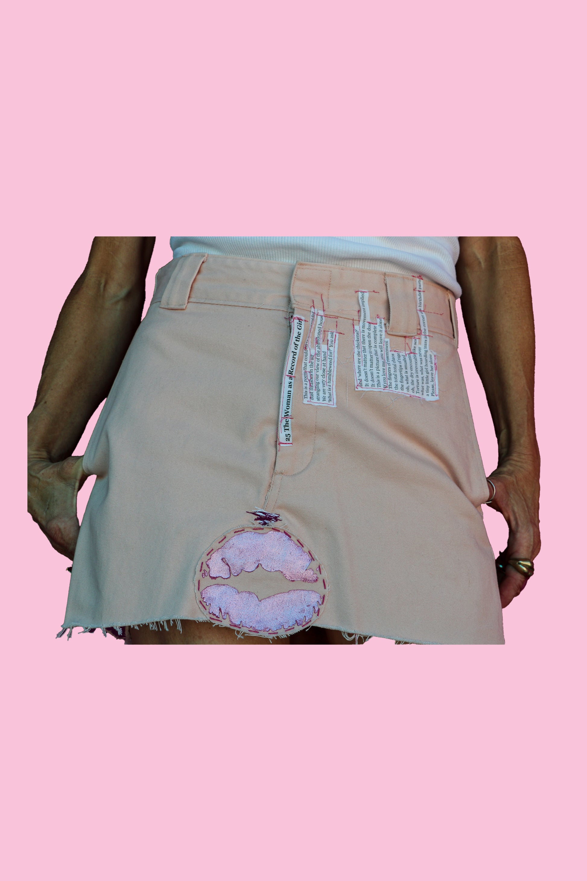 #25 The Woman as a Record of the Girl/#41 The Girl Wandered Unprotected Blush Pink Miniskirt W/Hand-painted Lips Patch