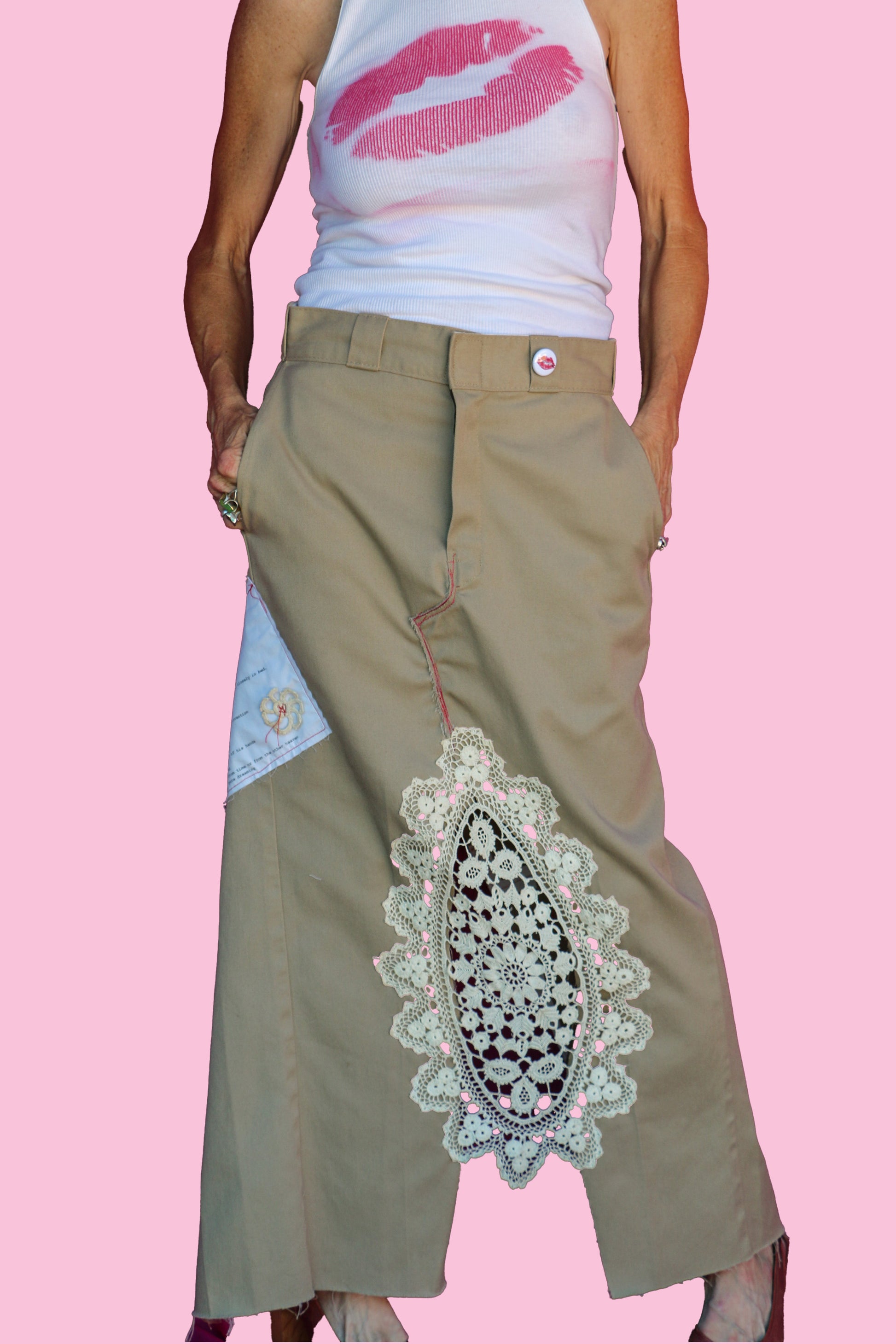 Originally a pair of played out Dickies, I created this skirt using my Husqvarna sewing machine and the beautiful words of Margaret.