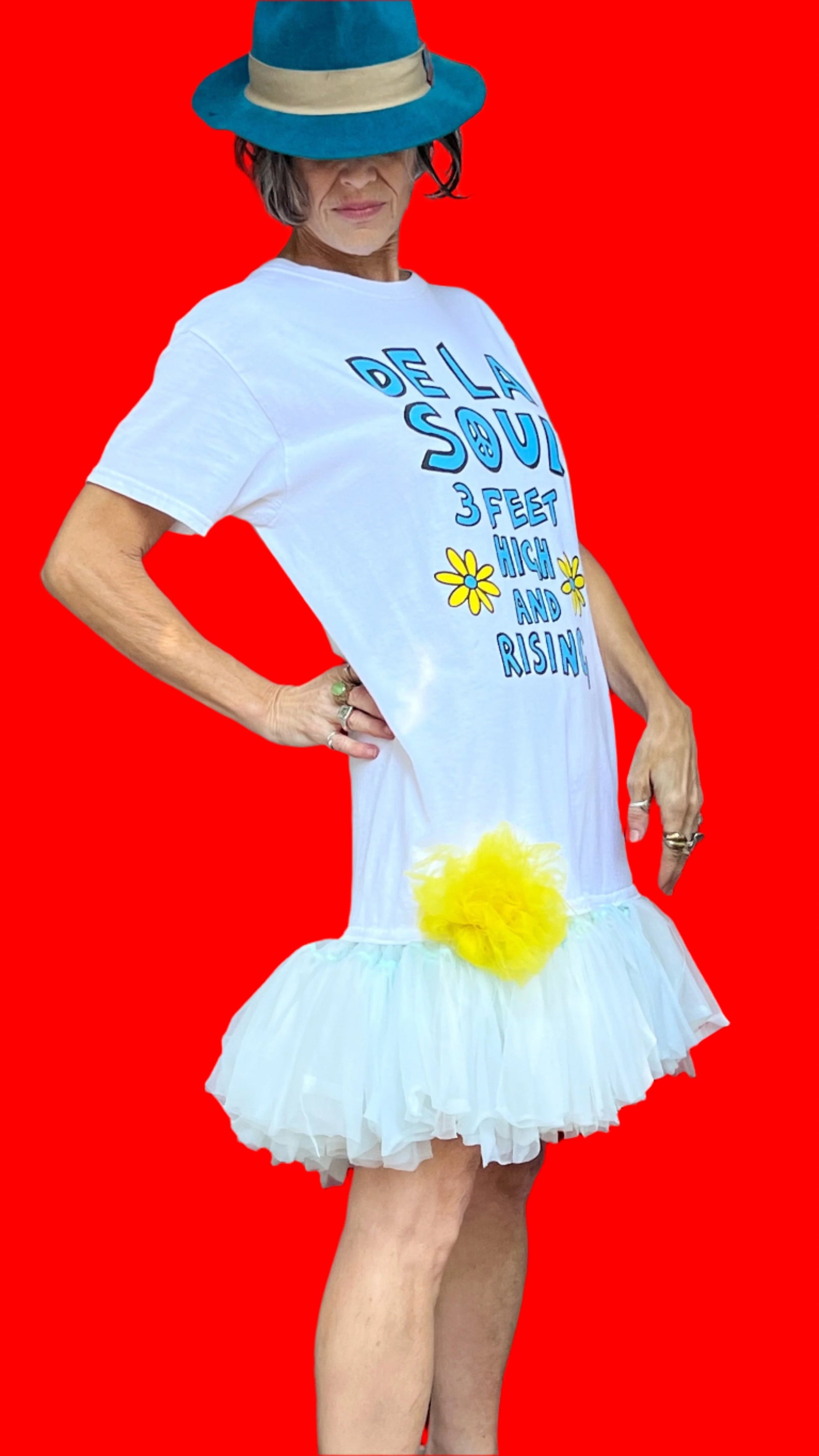 Contents: White De La Soul t-shirt + vintage child's crinoline ruffle slip + Handmade yellow tulle flower from old bee halloween costume.