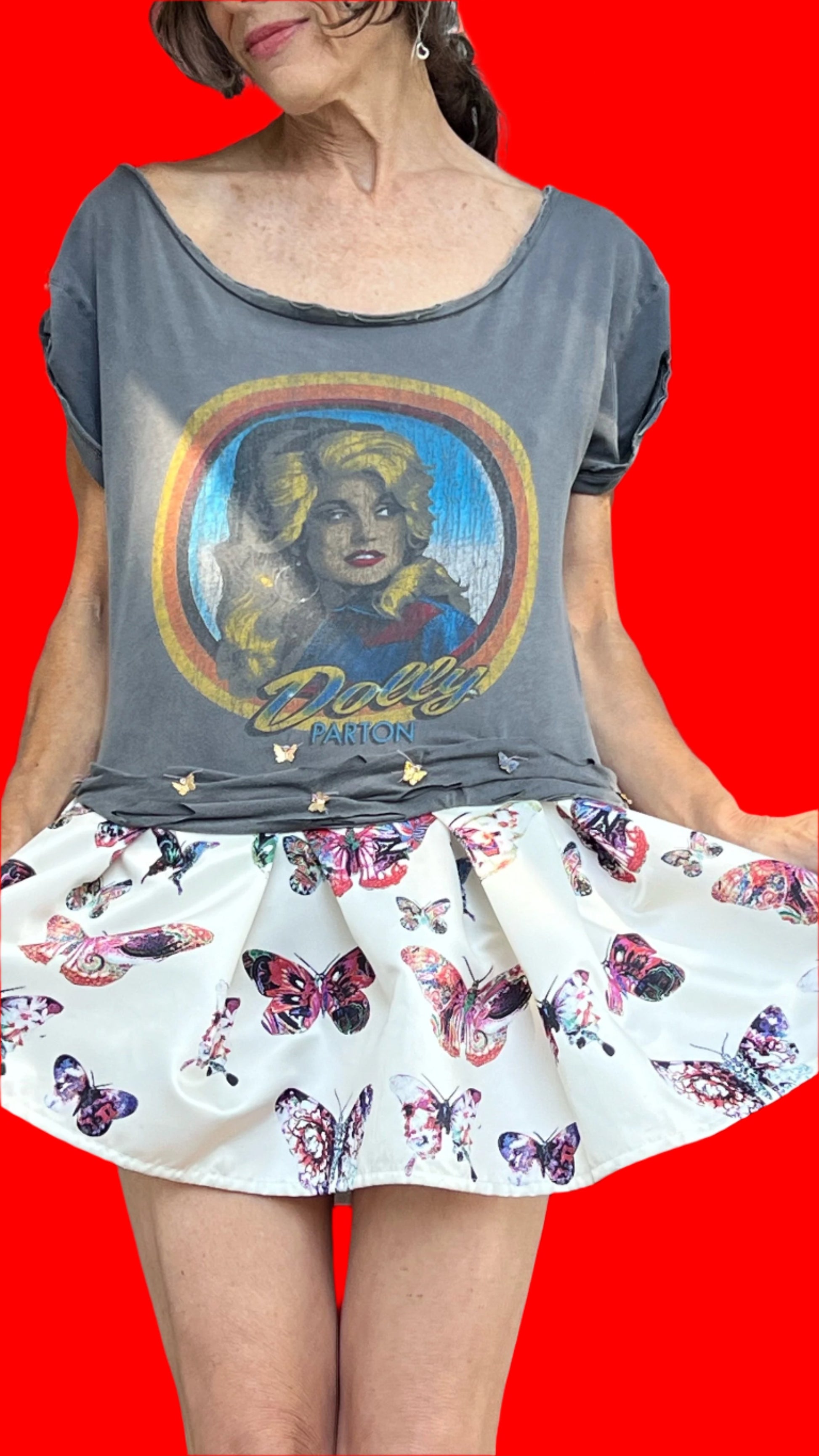 Contents: Distressed, washed-out, grey Dolly Parton scoop-neck/off shoulder t-shirt + bottom of thrifted, satin butterfly skirt + butterfly charms everywhere.