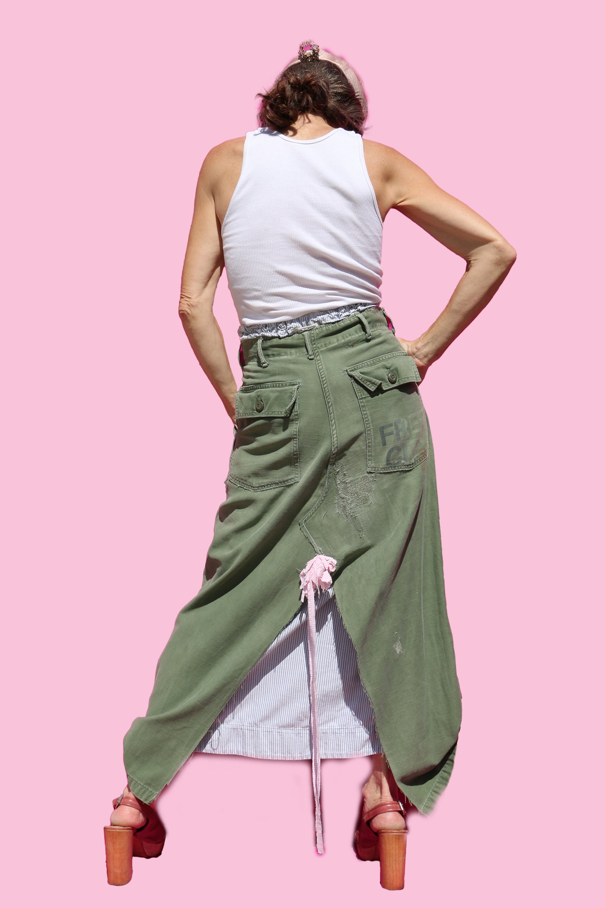 Vintage 70's Moleskin Army Pants Maxi Skirt W/Blue& White Stripe Drawstring Waist Underskirt & Handmade Pink & White Stripe Flower on Back
