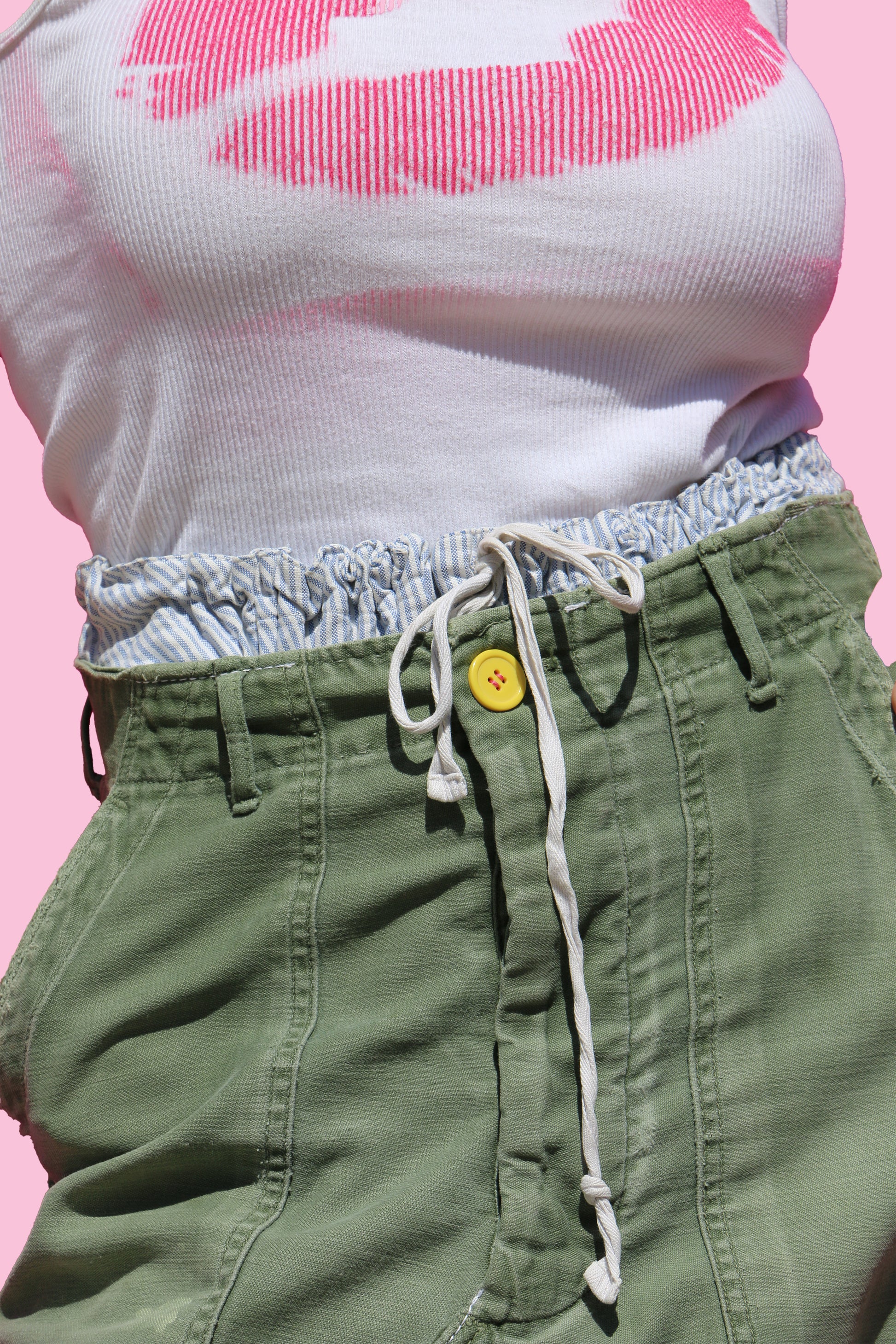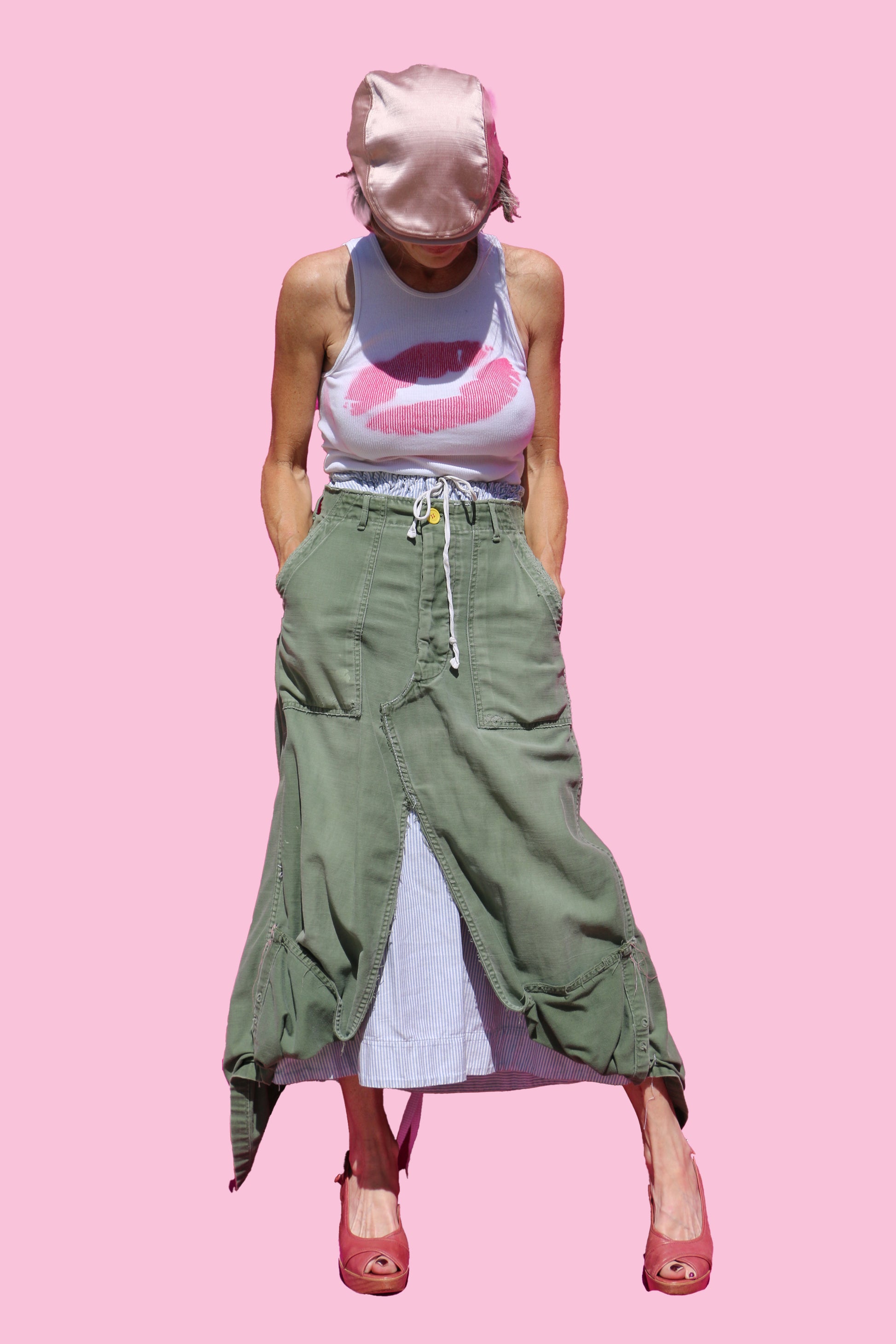 These vintage 70's distressed, moleskin army pants have many visible repairs which I love. They are so worn in they feel like you're wearing your pajamas so...... I decided to use my old nightgown as the underskirt. Nightgown drawstring sits above the waist. Looks so cute when you cinch it in. I added a sweet, contrasting pink and white handmade flower that sits in the back.