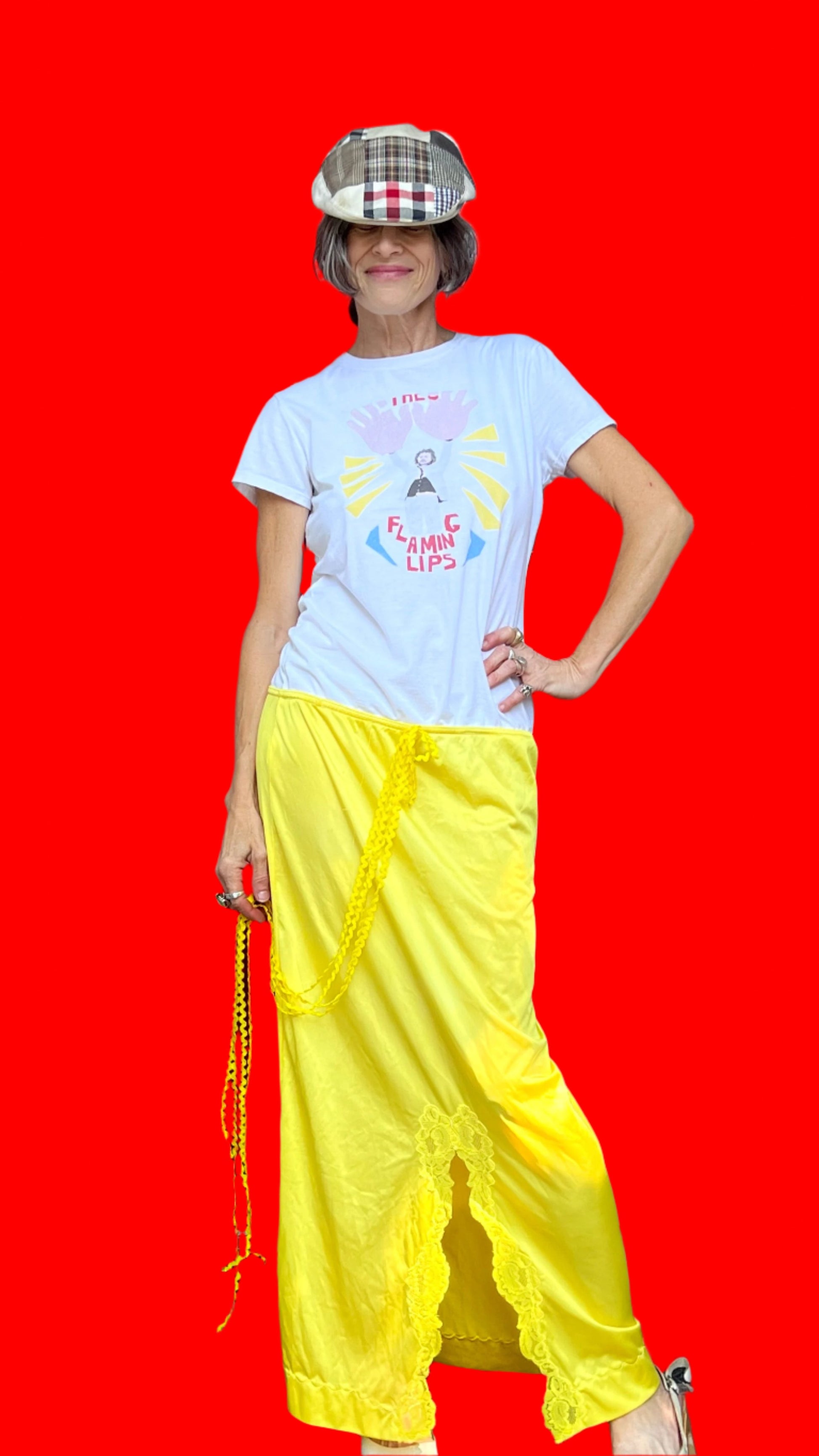 Contents: Iconic, white, short-sleeve Flaming Lips Big Hands t-shirt + vintage 60's hand-dyed yellow, maxi, elastic waist half-slip w/ front lace slit + yellow ricrac waist tie.