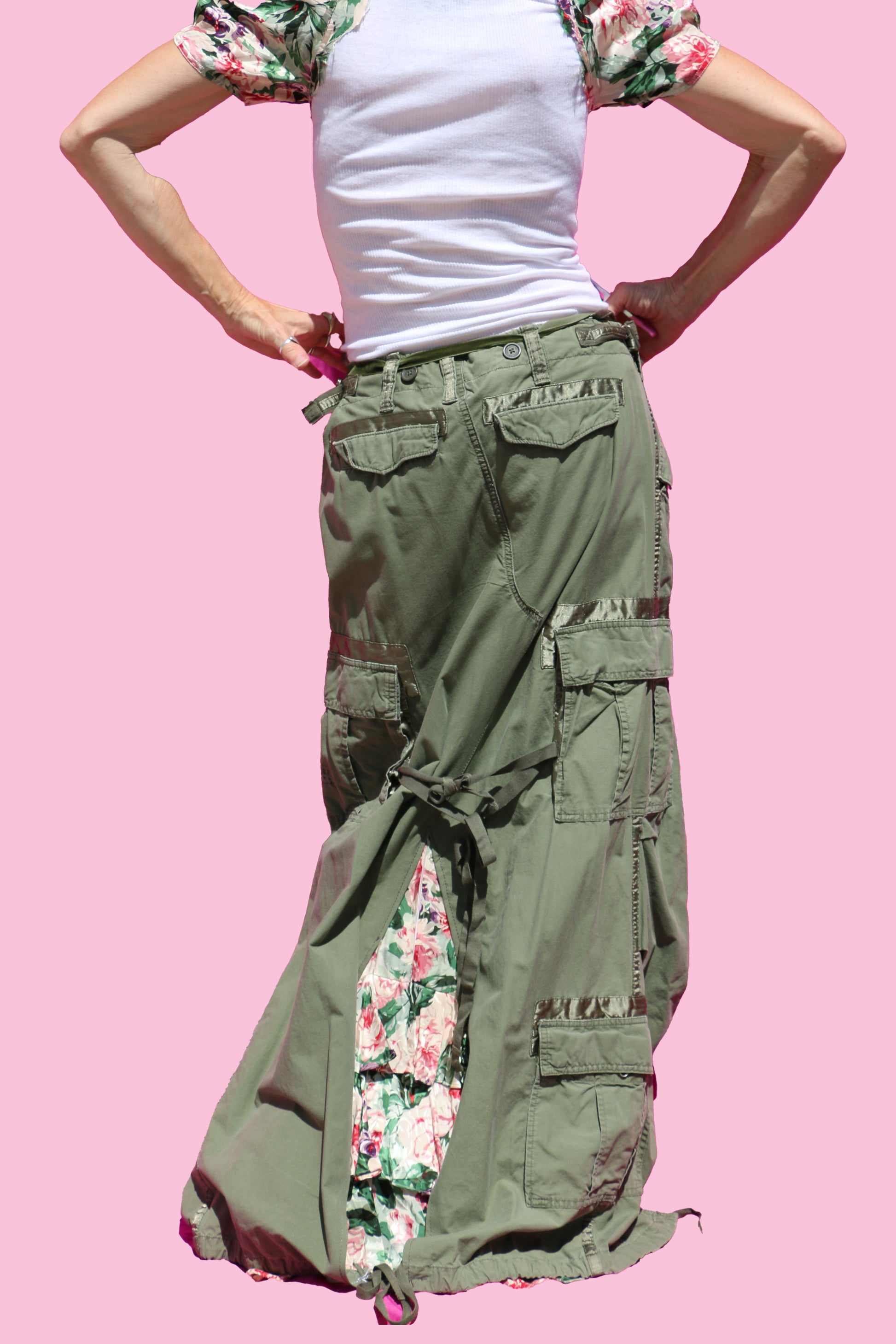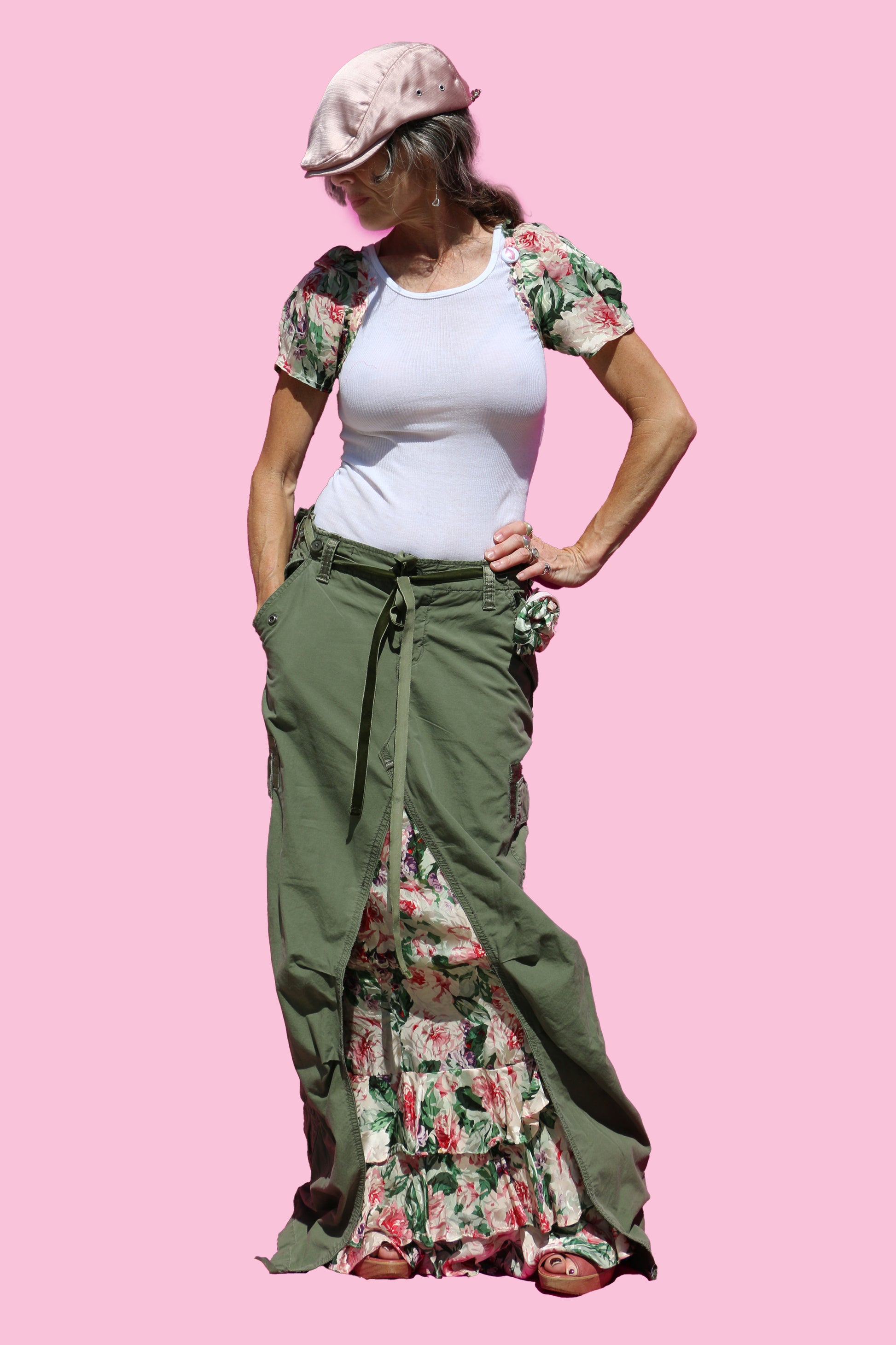 Army Green Cargo Maxi Skirt W/Silk Floral Ruffled Underskirt & Matching Tank W/Matching Silk Floral Sleeves & Handmade Flower