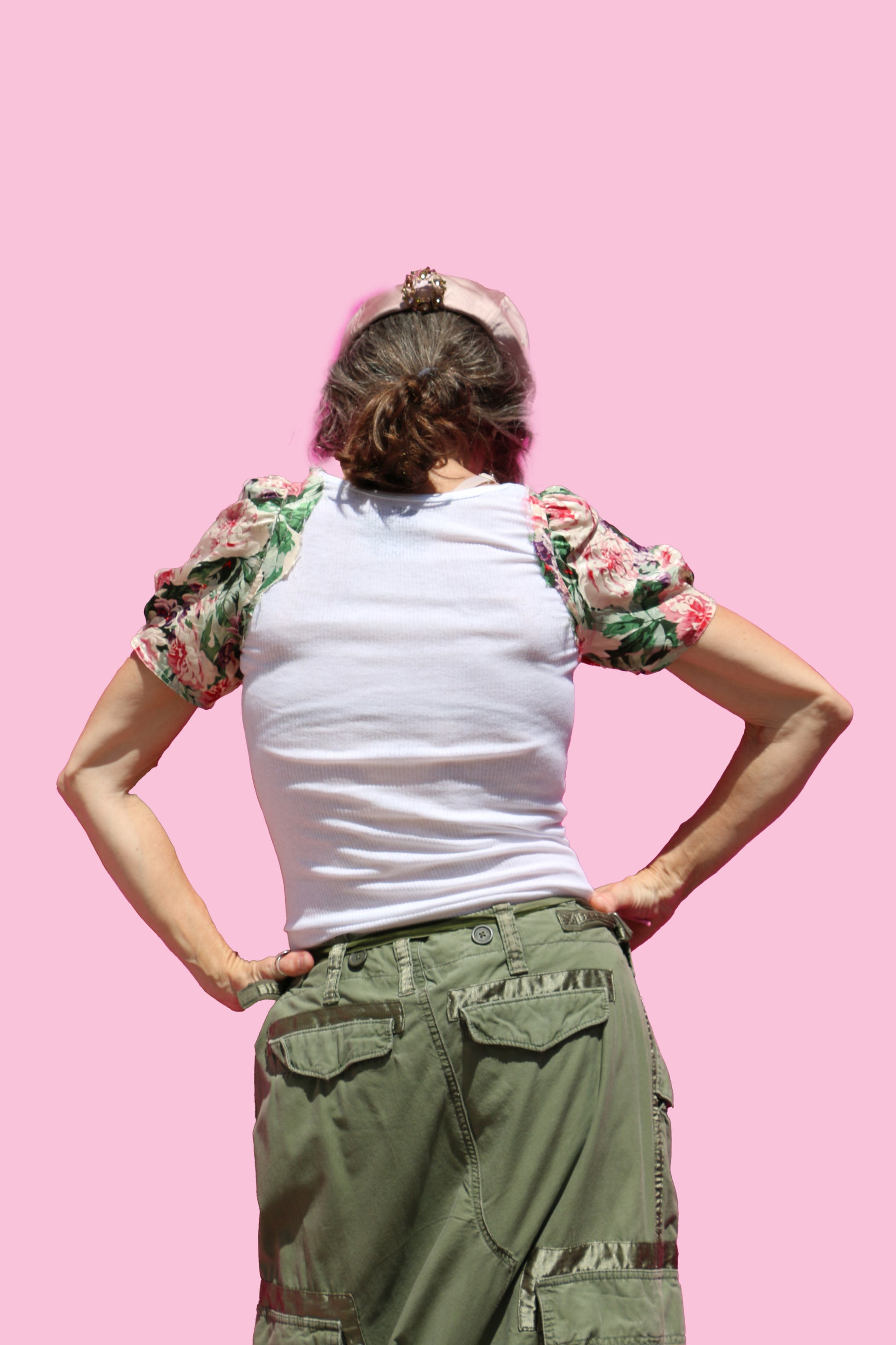 Contents: My 90's Abercrombie army green cargos + thrifted, ripped silk floral dress + never worn Hanes white tank + dress silk floral sleeves + handmade silk scraps flower.