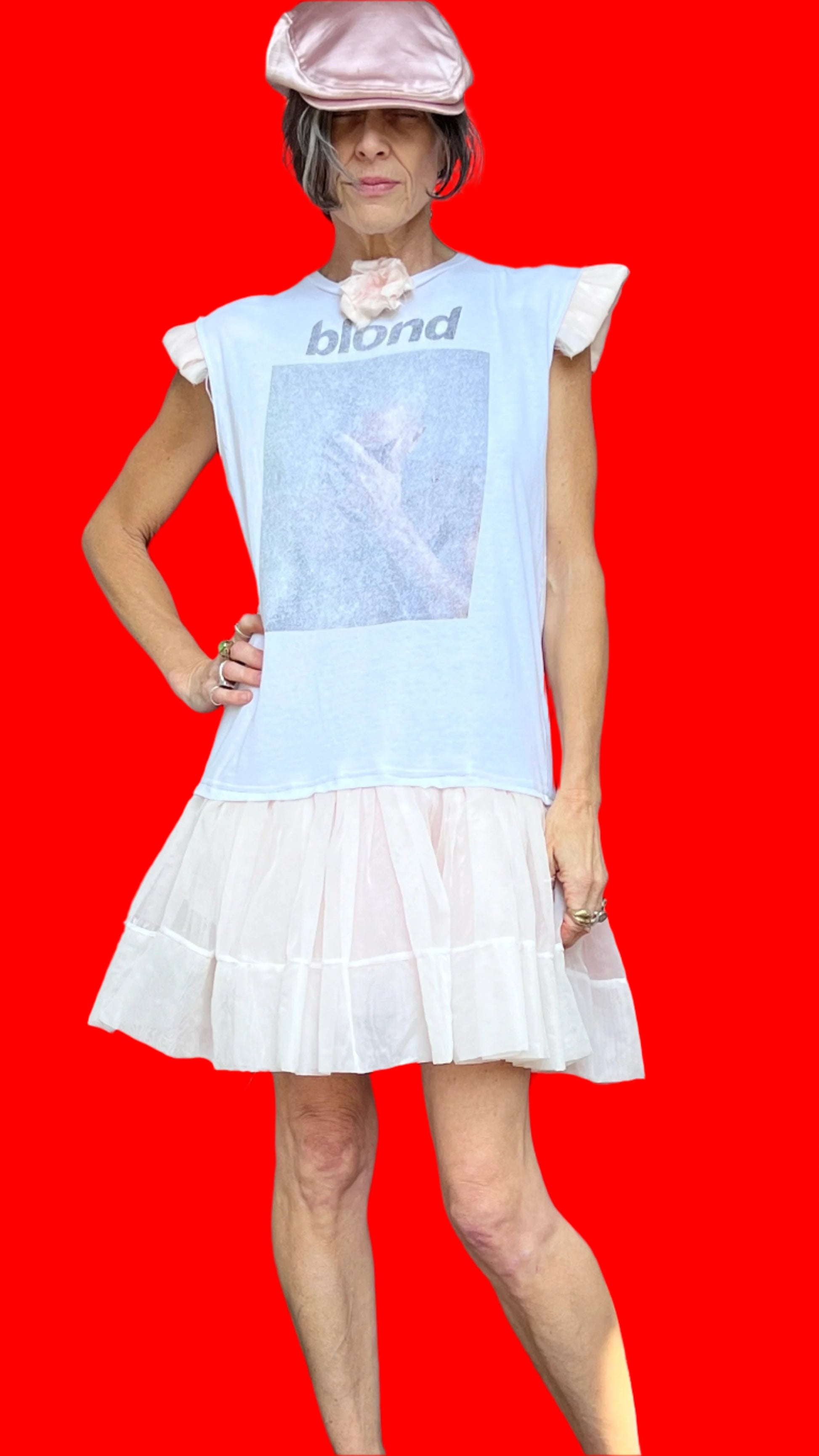 Contents: White, faded Frank Ocean t-shirt + vintage 1950's pink voile trashed girl's communion dress + dress waistband scraps used for sleeve detail & handmade flower.