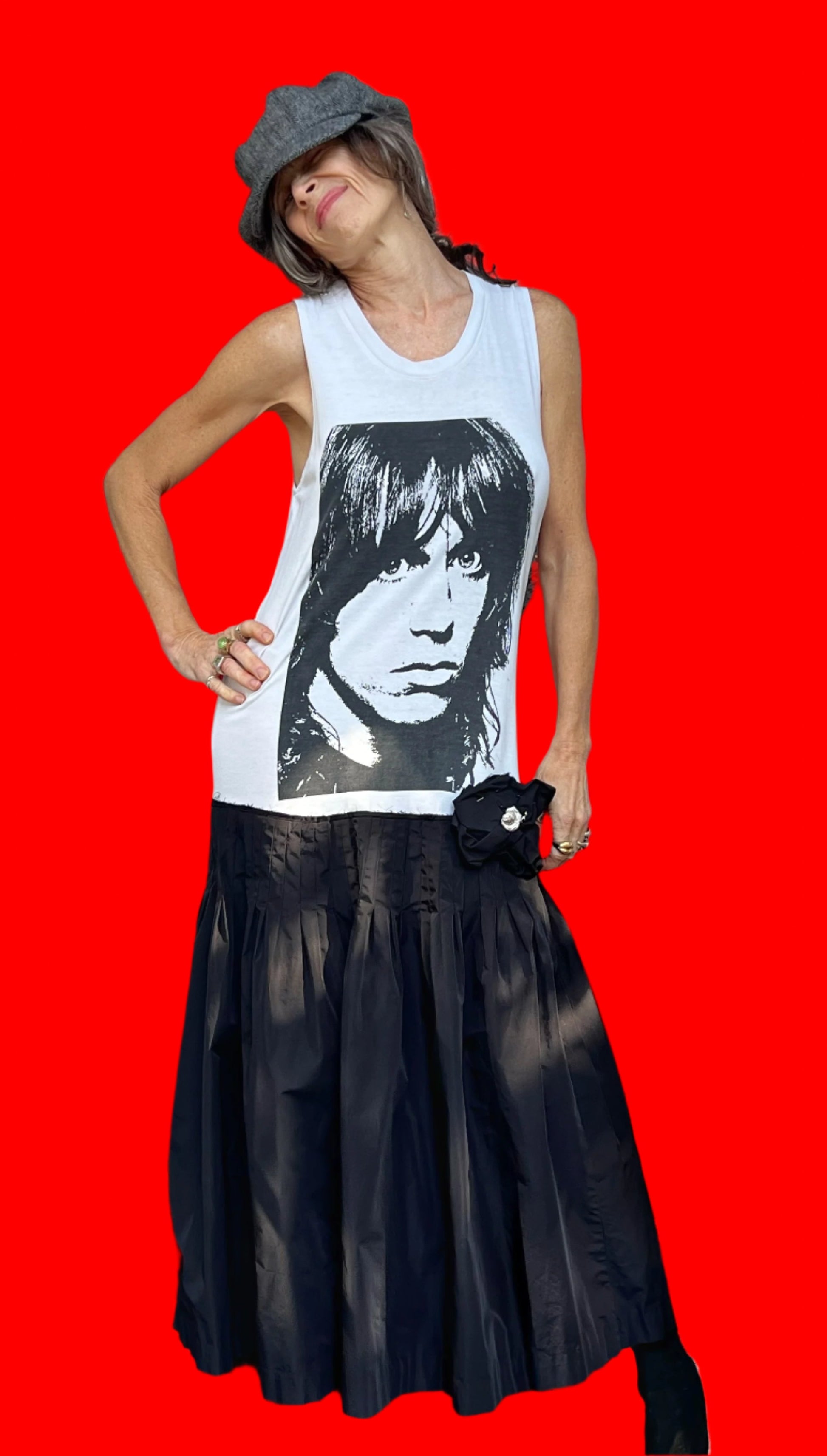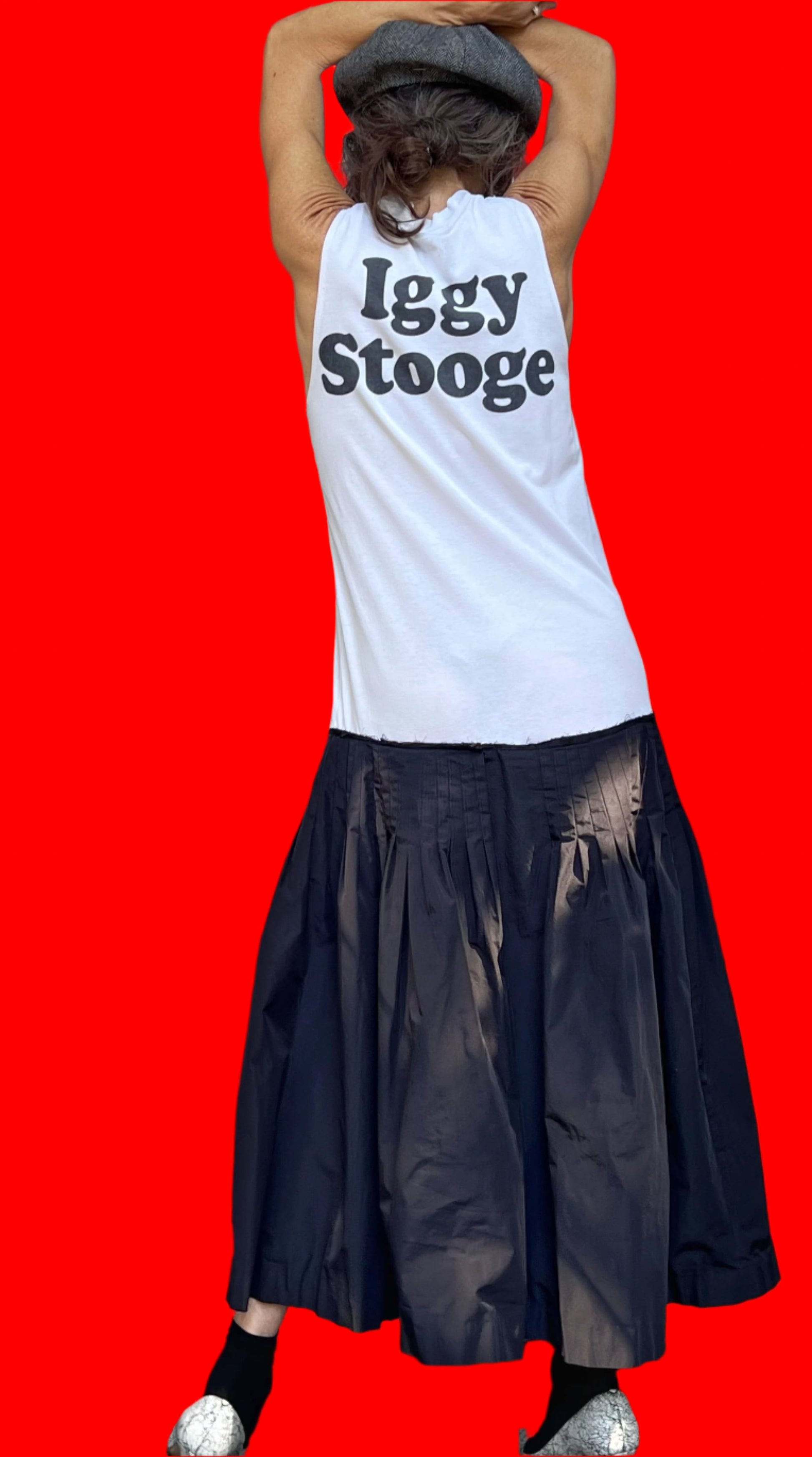 Contents: Extremely rare, vintage, white Iggy Pop & The Stooges long t-shirt + bottom half of my mom's black taffeta ball gown + scrap handmade taffeta flower.