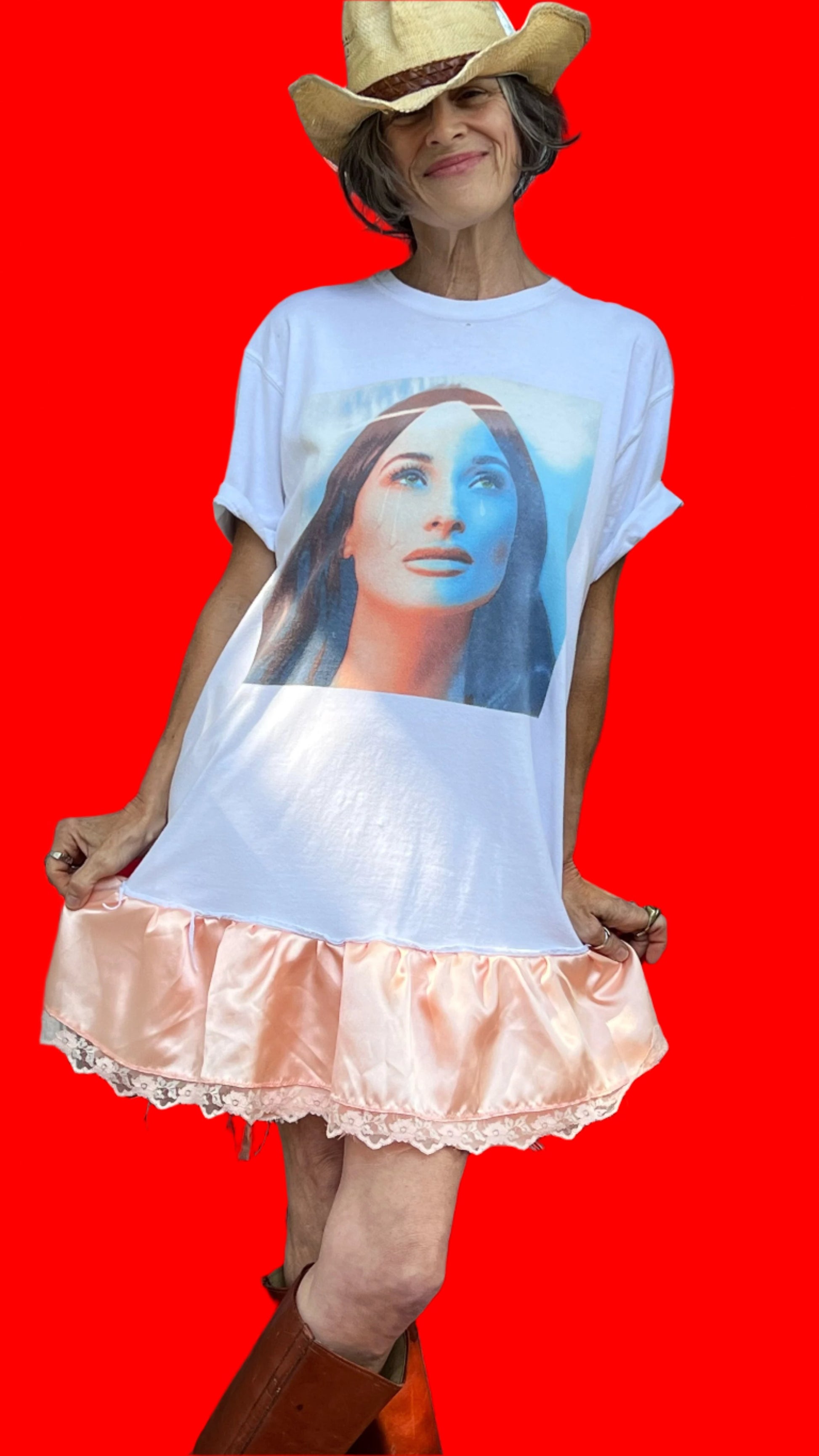 Kacey Musgraves White & Peach Satin Lace, Short-Sleeve, Dropwaist, Minidress W/Sweet Tie