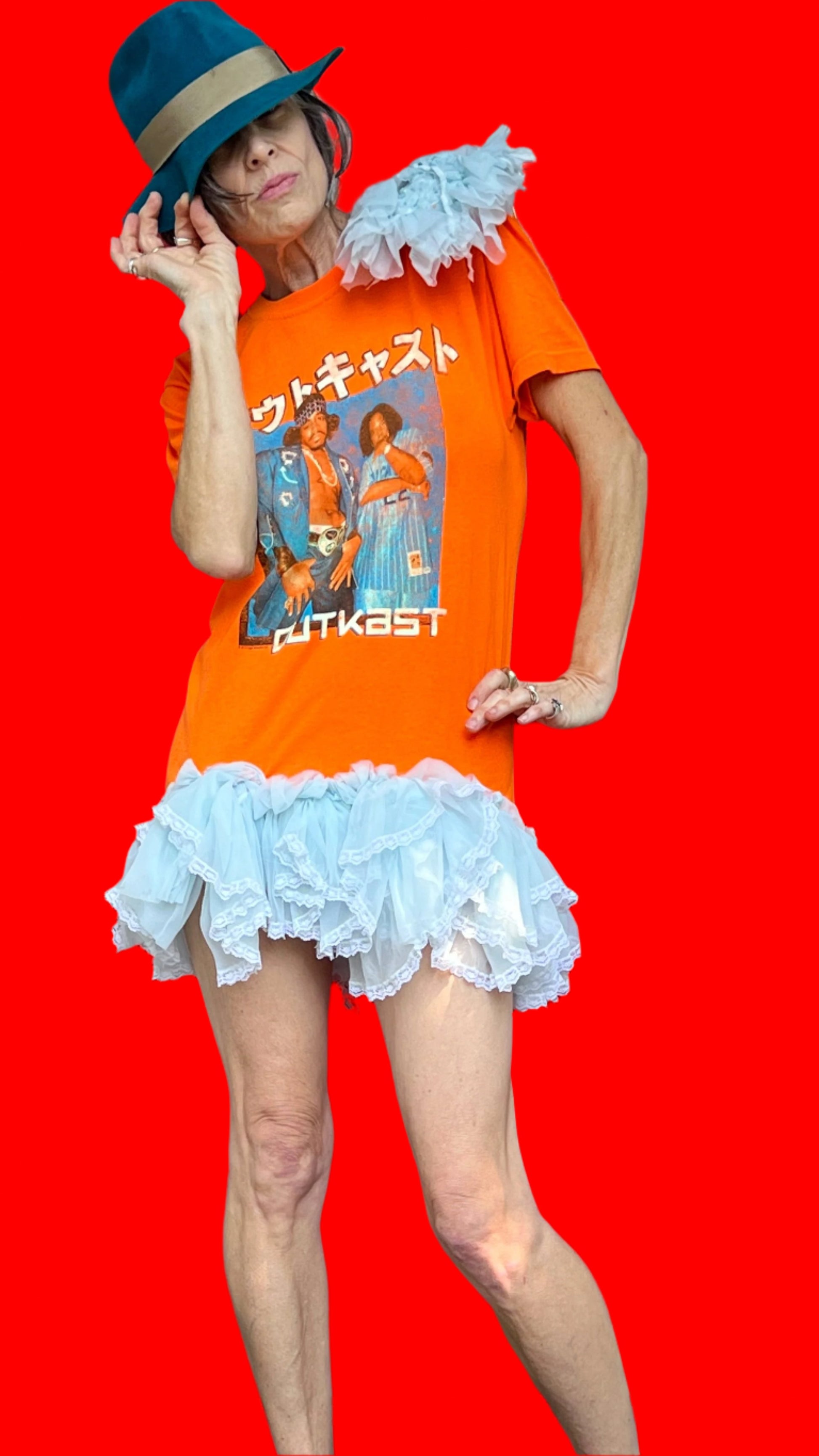 Contents: Rare, orange Outkast t-shirt + vintage powder blue/white lace shredded girls 1950's slip + handmade scrap flower