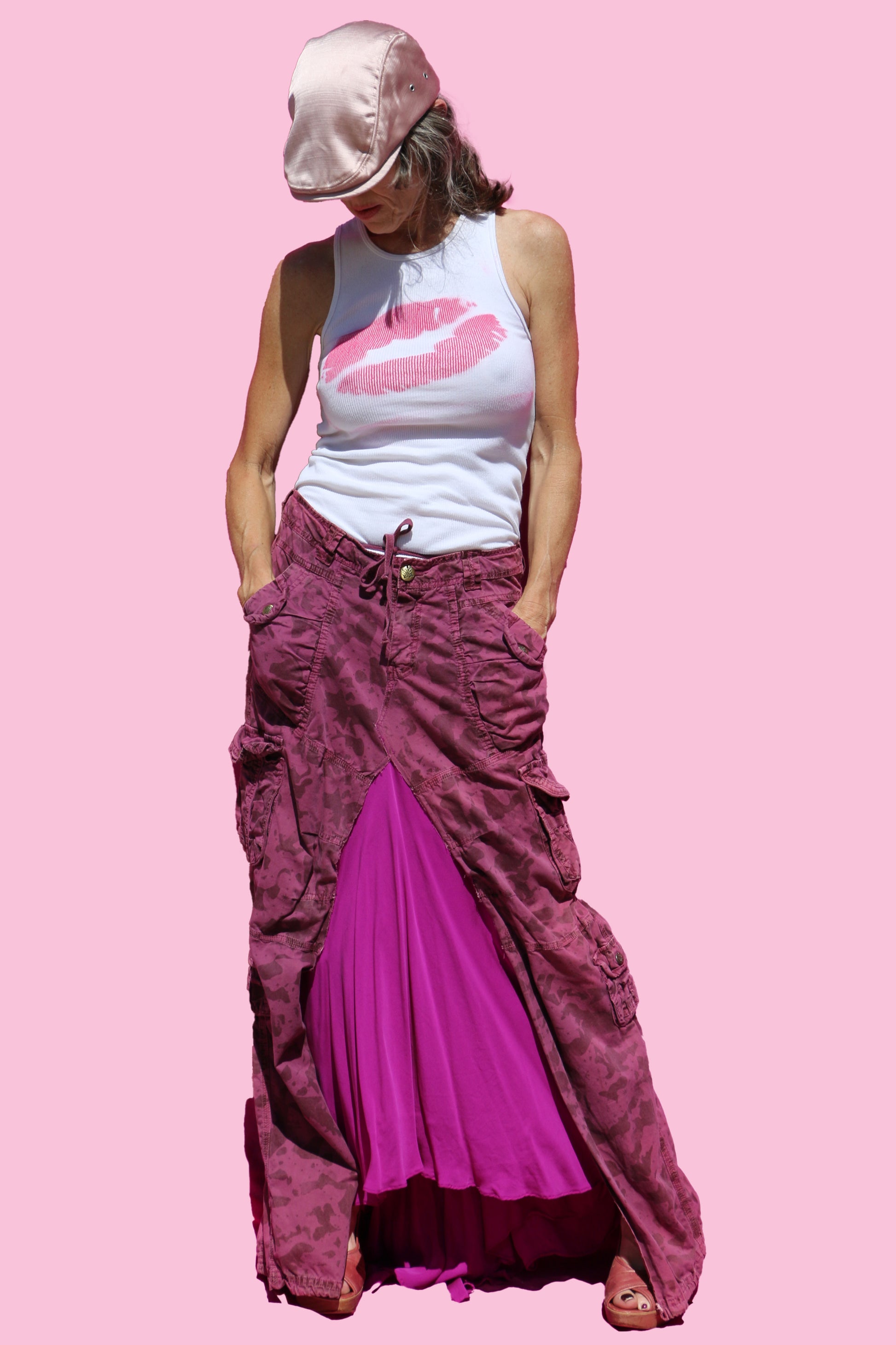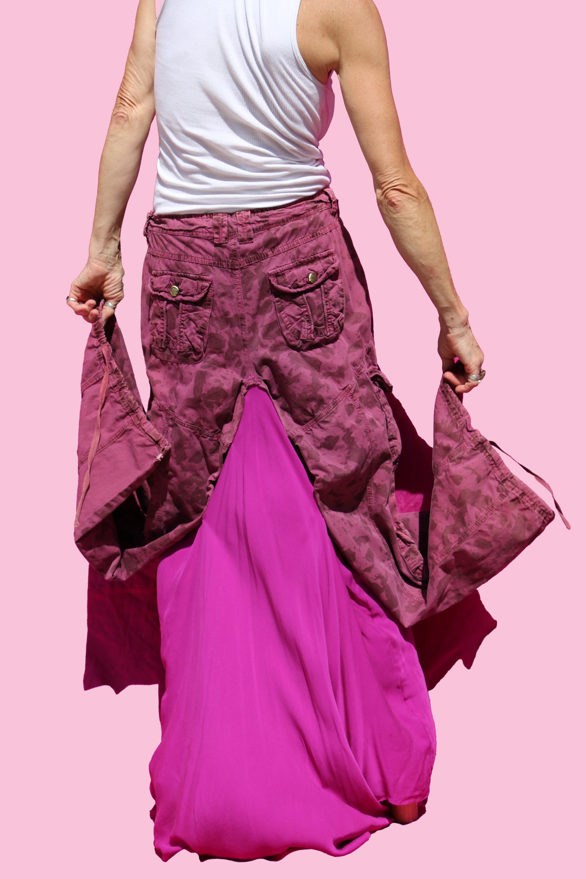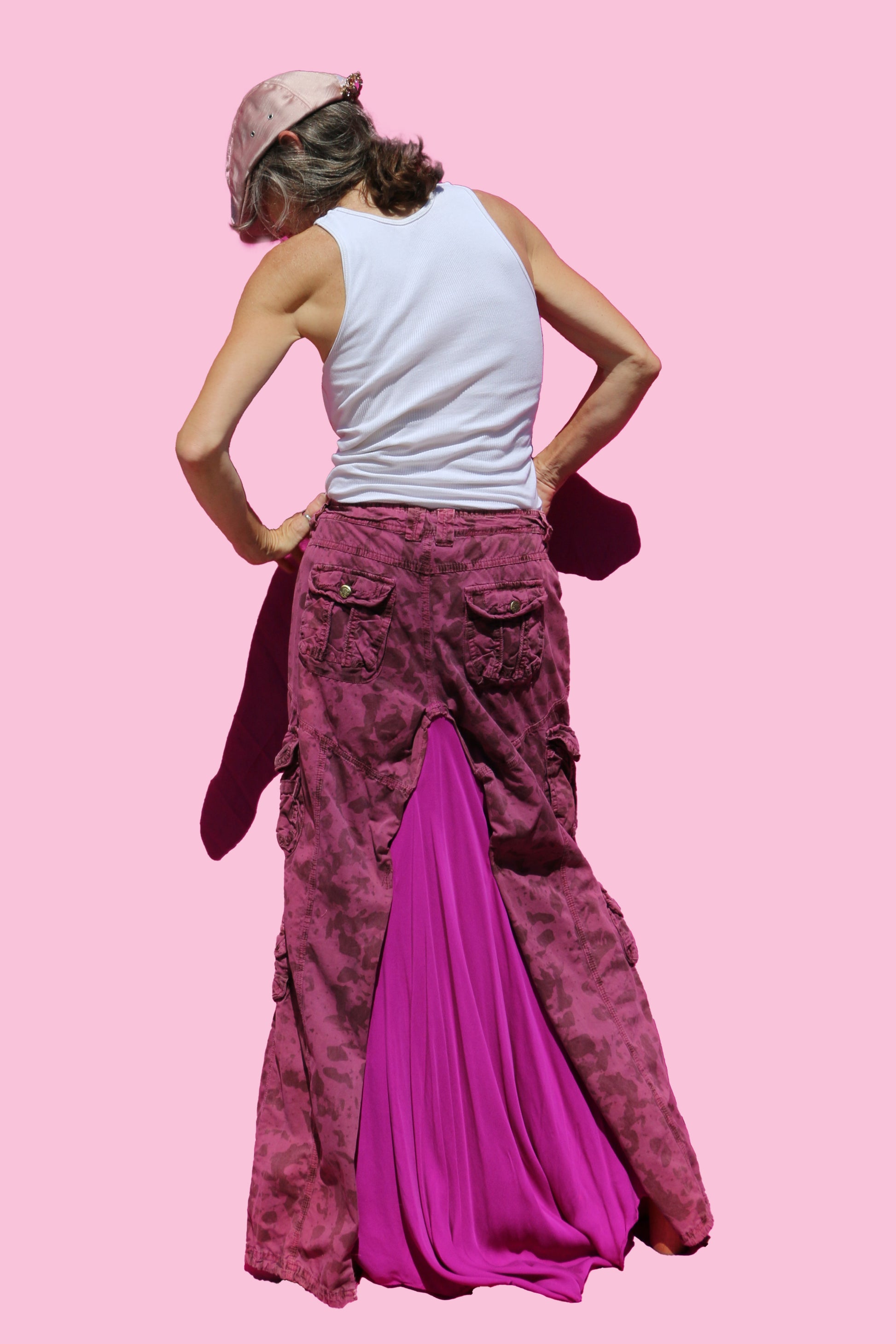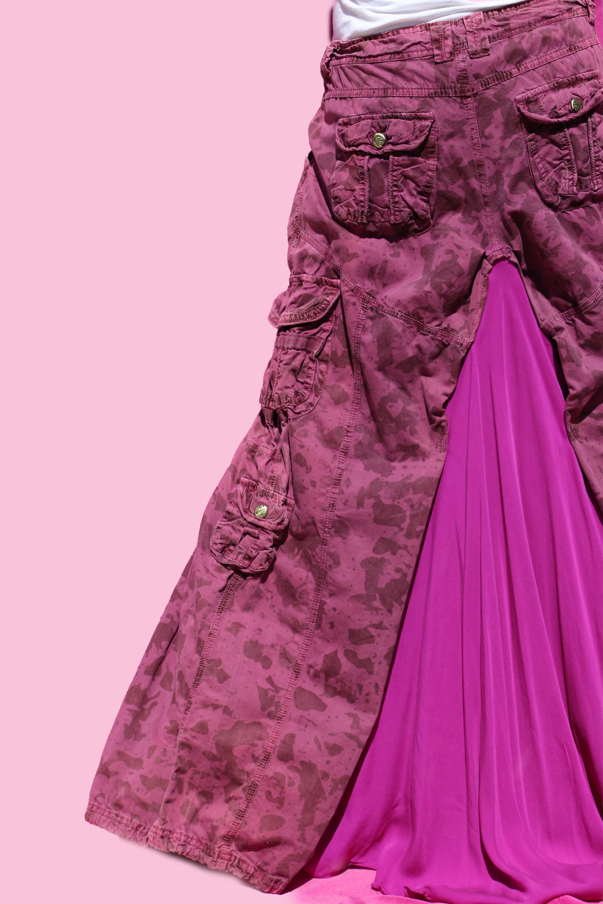Contents: Thrifted, 90's burgundy cargo pants + bottom half of magenta silk dress.