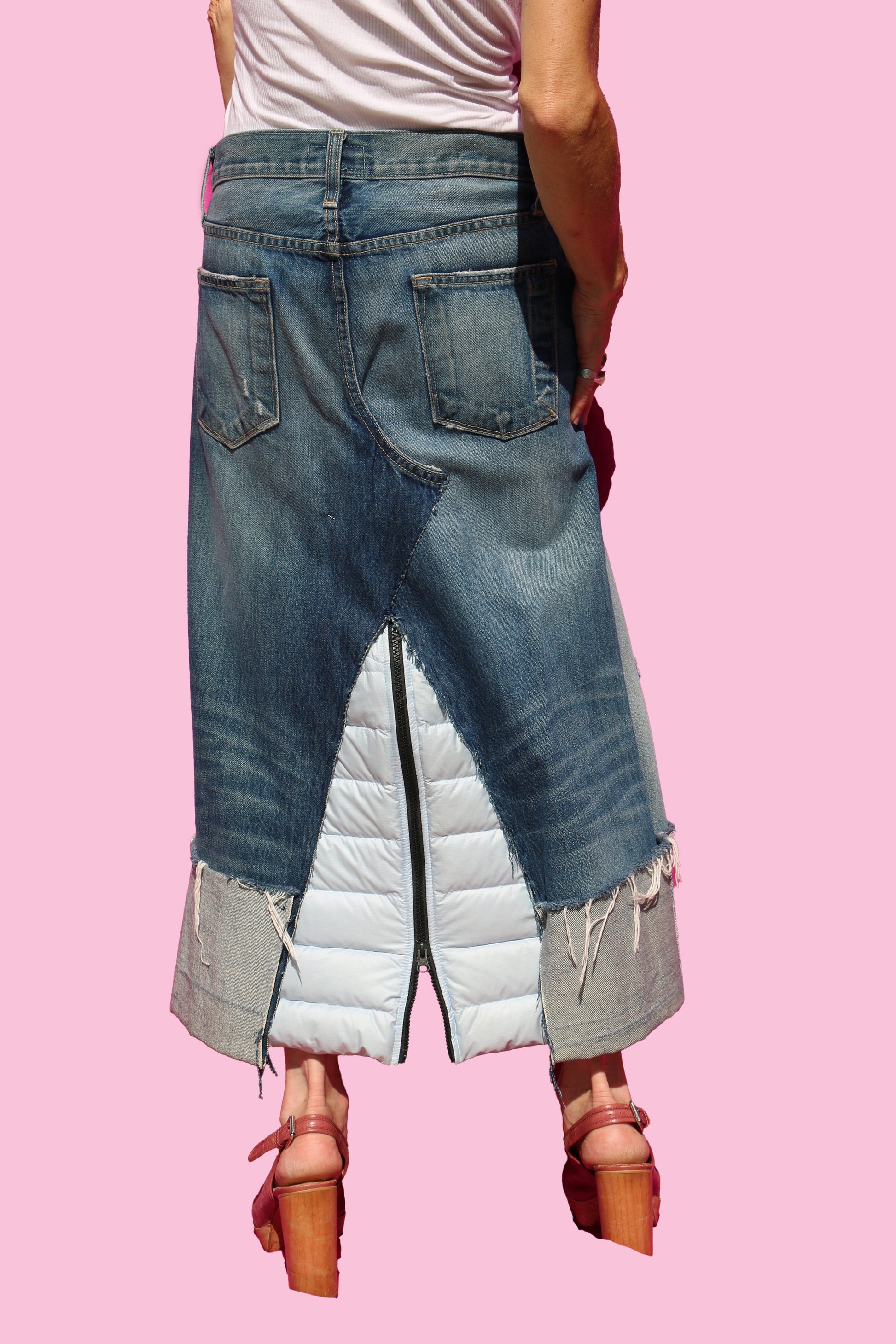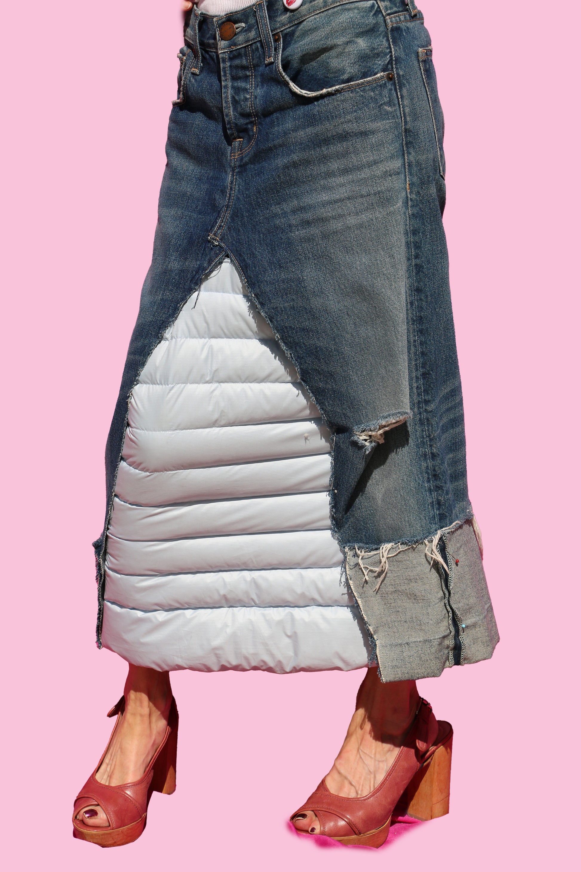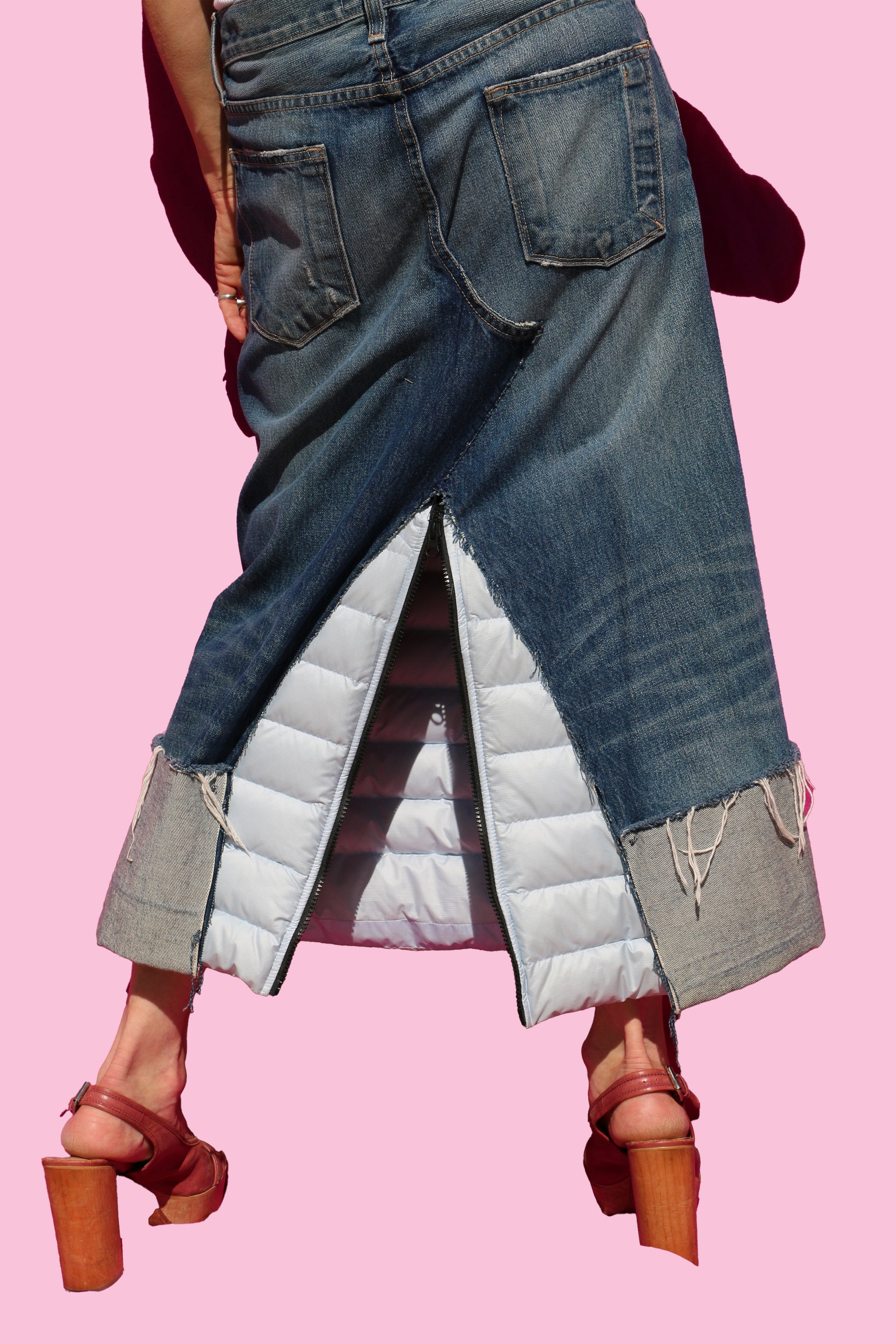 Distressed, Cuffed Denim Midi-Skirt W/Powder Blue Down Puffer Insert & Zipper Slit Back
