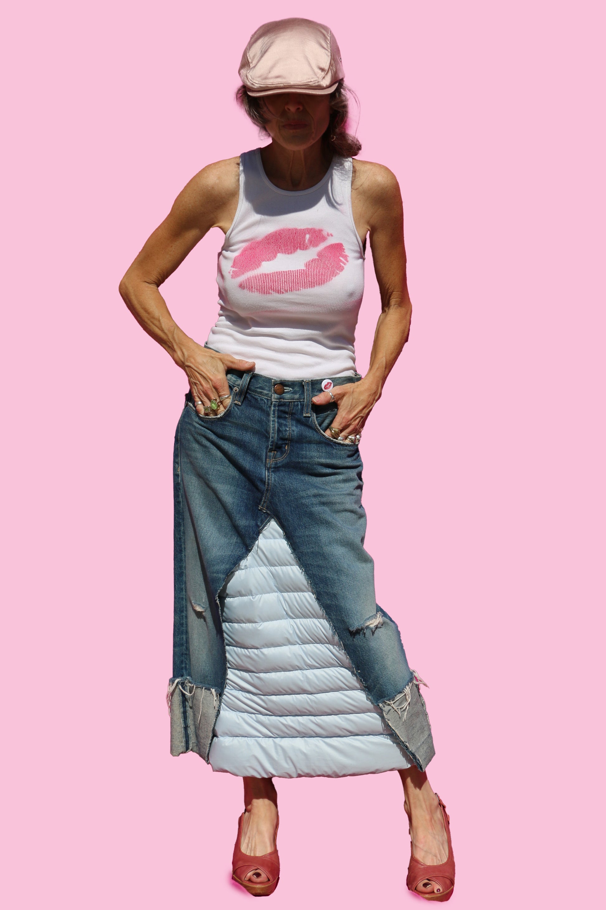 Warm on top, legs are freezing? I'm from Chicago! I know! I took some played-out Current/Elliot jeans and attached a thrifted puffer vest. I kept the zipper so you can adjust the back slit. This puppy is warm!